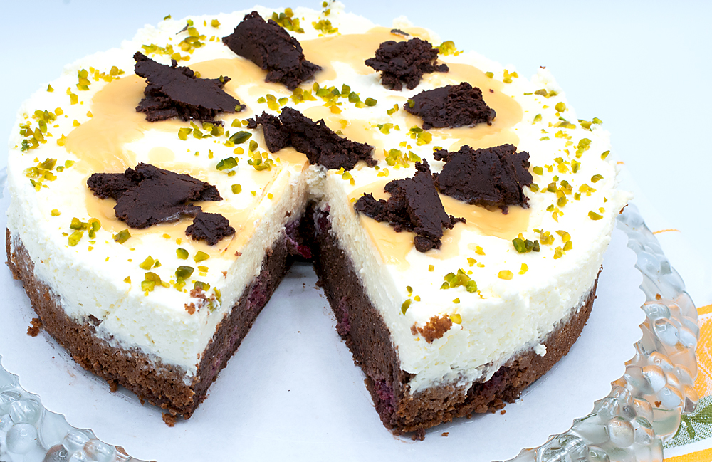 - Ubitą śmietanę wyłożyć na wystudzone ciasto ,wygładzić i łyżką zrobić kilka wgnieceń . Na koniec polewamy likierem ,dekorujemy czekoladą ,pistacjami dla kontrastu. Tort najlepiej serwować po kilku godzinach, prosto z lodówki .