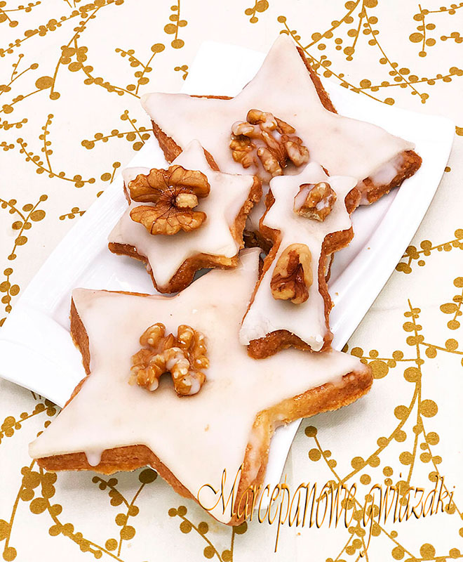 Mąkę, cukier, masło z solą i cynamonem zagnieść na kruche ciasto, i włożyć na 2 godz do lodówki. Po czym ciasto rozwałkowujemy, kładziemy na papier wyścielający blaszkę i wycinamy gwiazdki. Ciasto z pomiędzy gwiazdek ponownie zagniatamy, rozwałkowujemy i wycinamy gwiazdki, albo po prostu od razu wycinamy małe i duże. Blaszkę wsuwamy do piekarnika na drugą szynę od dołu. Pieczemy w 180°C 12-15 min. Masę marcepanową zagniatamy z cukrem pudrem/125 g/ . Wyrobioną masę umieszczamy pomiędzy dwiema foliami i rozwałkowujemy możliwie jak najcieniej, po czym wycinamy takie same gwiazdki jak wycinaliśmy z ciasta. Ostudzone ciastka gwiazdki smarujemy letnim żelem z czarnego bzu i układamy na nich gwiazdki wycięte z marcepanowej masy. Orzechy namaczamy w syropie z czarnego bzu, gwiazdki smarujemy lukrem i na każda kładziemy polówkę orzecha.