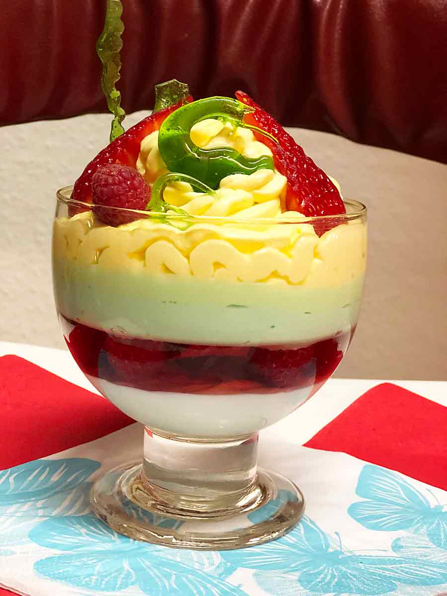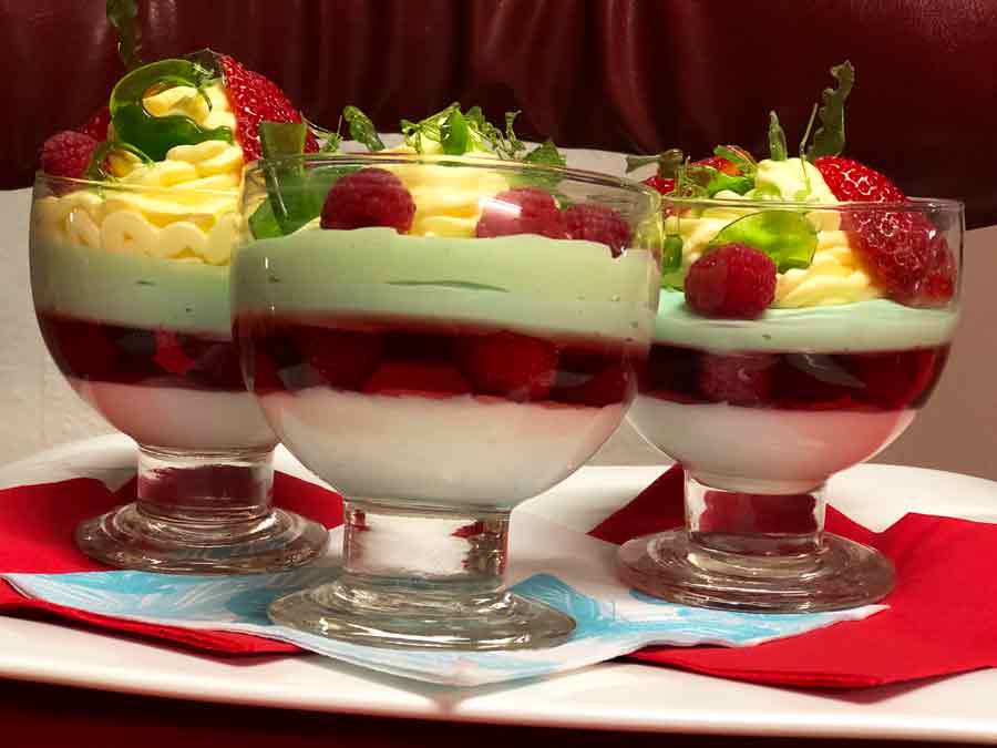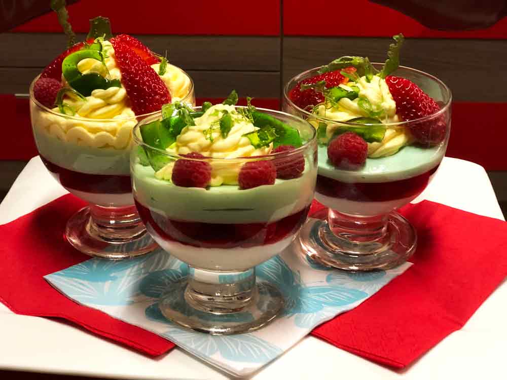 Zagotować pól litra wody i wsypać 1 1/2 galaretki, wymieszać i odstawić do zupełnego ostygnięcia. Namoczyć żelatynę w zimnej wodzie. Serek przełożyć do miski, wsypać cukier puder, cukier waniliowy i wymieszać. Żelatynę odciskamy z wody i w malej miseczce z dwoma łyżkami soku cytrynowego rozpuszczamy sekundę w mikrofali. Do miseczki z żelatyna dodajemy łyżkę serka szybko mieszamy, dodajemy jeszcze jedną, mieszamy i dodajemy do miski z serkiem również od razu sprawnie mieszając. Łączenie żelatyny z zimnymi produktami, to jest zawsze stresujący moment dla nowicjuszy, więc często ten moment dokładnie opisuję. Następnie  serek dzielimy na dwie części i do jednej dodajemy zielony barwnik /pól łyżeczki-odrobinę zostawiamy w tubce do  preparatu na dekoracje /, odstawiamy w ciepłe miejsce, a biały rozkładamy na dna naczyń deserowych. Naczynia z serkiem wstawiamy do lodówki, możemy w lodowce nieco wyższy stopień chłodzenia włączyć. Po godzinie na serek możemy już wlać żelatynę, robimy to powoli najlepiej łyżką wazową opuszczając ją z żelatyną blisko serka. Dzielimy po równo do każdego pucharka i wrzucamy po równo malinki, ca. 5 sztuk do jednego najlepiej umieścić je przy samych ściankach, aby potem były widoczne. Znowu wstawiamy naczynia  do lodówki na godzinę, po czym na galaretkę rozkładamy po równo do każdego pucharka zielony serek i powtórnie wstawiamy do lodówki. W ostatniej już fazie namaczamy 3 listki żelatyny, gęstą śmietanę mieszamy z cukrem pudrem, a kremówkę ubijamy na sztywno. Żelatynę odciskamy z wody i  łyżką soku cytrynowego sekundę podgrzewamy w mikrofalówce, po czym dodajemy dwie łyżki gęstej śmietany wymieszanej z cukrem i szybciutko kręcimy, po czym wlewamy do gęstej śmietany, znowu szybko mieszamy i dodajemy ubitą śmietanę wszystko razem mieszając. Na koniec dodajemy żółty barwnik.przygotowany crem śmietanowy,  wstawiamy na pół godz do lodówki, po czym wkładamy go do woreczka foliowego z końcówką np. gwiazdki i robimy dowolny wzór na serniczkach. Na śmietanę kładziemy po 1 truskawce przekrojonej na pół, albo na ćwiartki i resztę malinek. Ja udekorowałam jeszcze zielonym  odlanym  preparatem, którego nie mogę nazwy użyć, bo usuwany jest Post, który zabarwiłam na zielono barwnikiem zostawionym przy barwieniu serka.