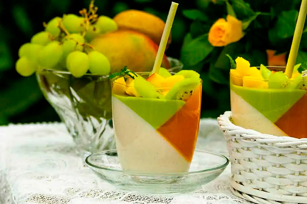 Deser ten sporządziłam z owocu mango, śmietany i mleka a także dodałam japońskiej zielonej herbaty w proszku jako jednego z barwników. Te trzy kolory i smaki wyśmienicie się komponują tworząc delikatny, śmietankowo -owocowy smak tego deseru.