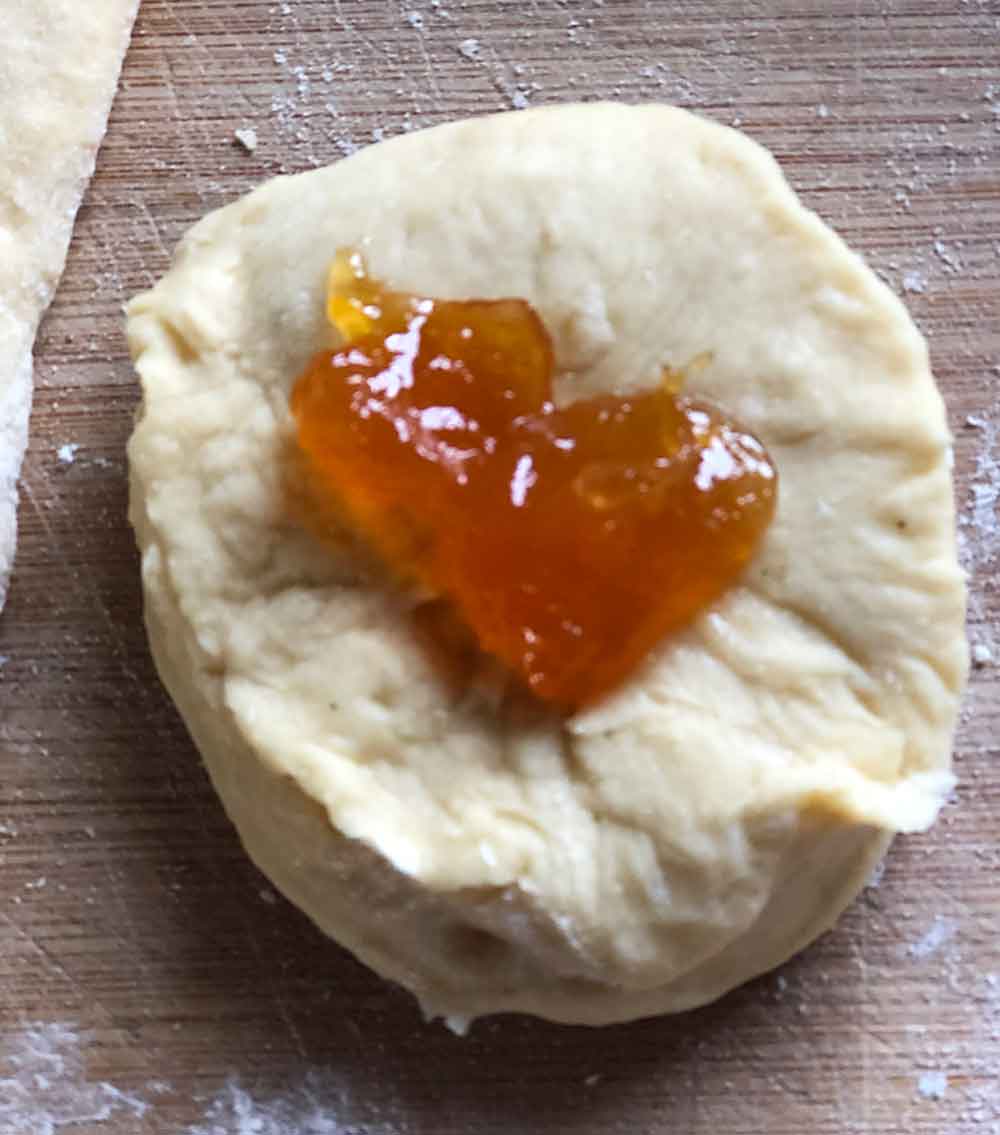 Każde koło w rękach trochę rozgniatamy i nakładamy po pół płaskiej łyżeczki marmolady, po czym sklejamy obrzeża koła ściągając je do góry i ściskając razem tworzymy w miarę równą powierzchnię, ale nie naciągamy za mocno z dolnej powierzchni, aby ta nie stała się za cienka i marmolada przez nią wyciekła. Nie kulamy ciasta już z marmoladą w rekach, bo ją przemieścimy, złącze samo się wyrówna, gdy będzie ponownie rosło. Kładziemy pączek tym sklejeniem na posmarowaną olejem /troszeczkę/ tacę lub inną płaską powierzchnię.