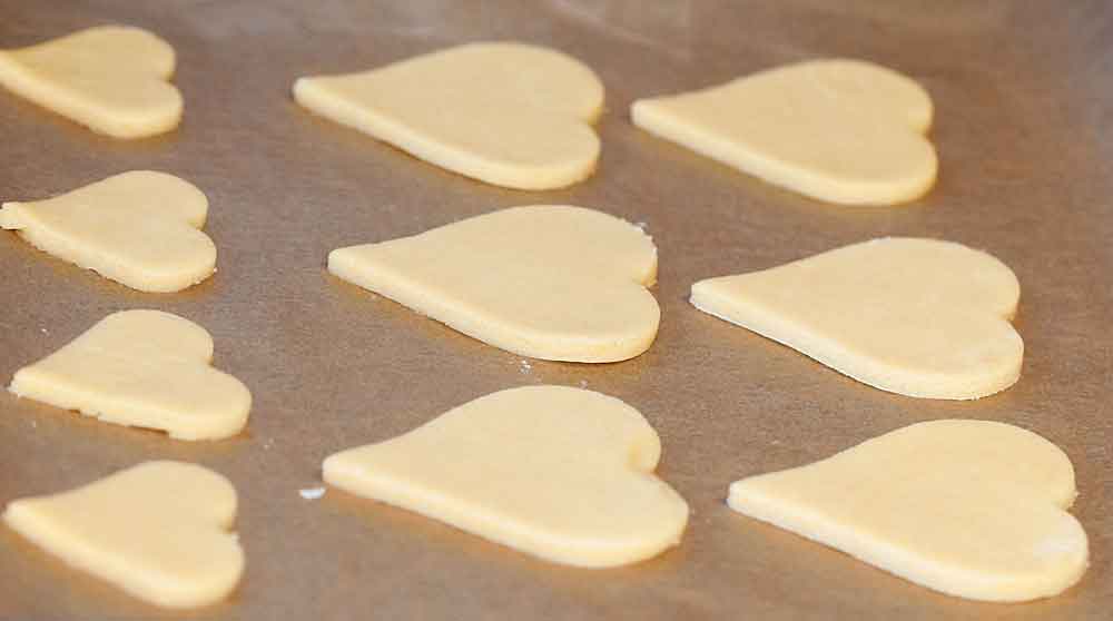 Następnie ciasto z lodówki wyłożyć na posypaną mąką stolnicę, rozwałkować na grubość ok. 0,5 cm i wyciąć tyle samo małych serduszek co dużych. W zależności od wielkości wycinarek w kształcie serca z tego ciasta można wyciąć 26-30 szt razem. Piekarnik nagrzać do 180°C góra – dół i piec ciasteczka 10-12 minut.