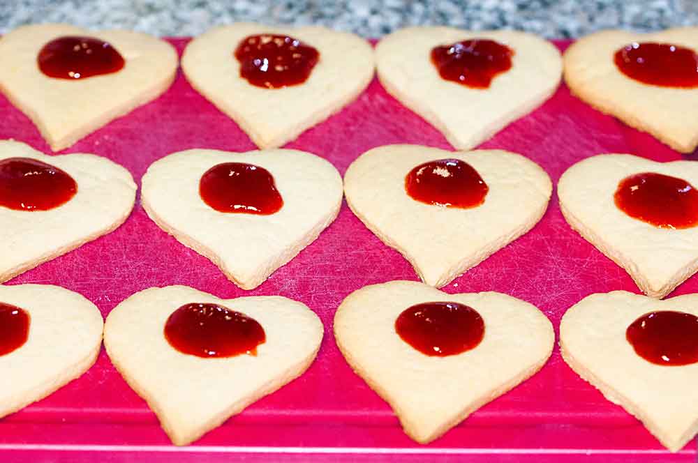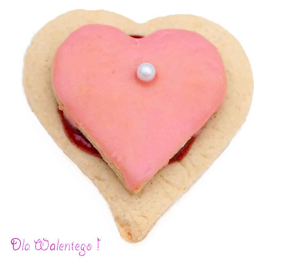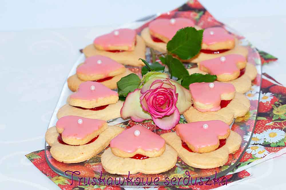 Po wyjęciu ciasteczek z piekarnika wykładamy je na kuchenną kratkę i studzimy. Przestudzone, mniejsze serduszka smarujemy polewą cukrową. Robimy ją tak samo jak każdy lukier. Sokiem cytrynowym rozrabiamy cukier puder i dodajemy kilka kropel czerwonego spożywczego barwnika. Marmoladę truskawkową rozgrzewamy i jeśli są w niej owoce, przecieramy przez sitko. Kładziemy na każde serduszko po pól łyżeczki marmoladki i przykrywamy mniejszym serduszkiem. Na środku małego, różowego serduszka kładziemy jedną perełkę. Smacznego!