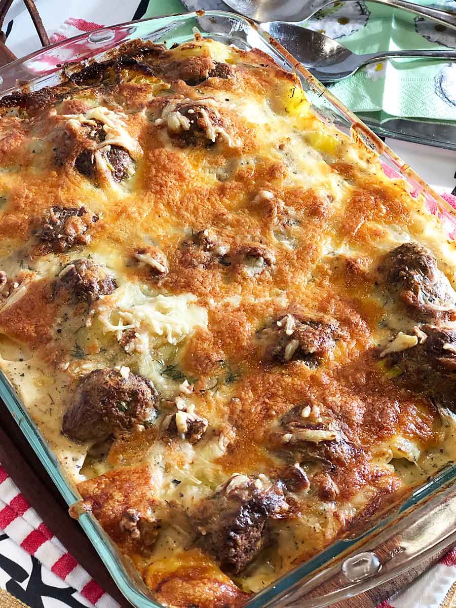 Kartofle obrać i ugotować 15-20 min z solą. Piekarnik nagrzać do 180°C. Cebulę obrać i drobno poszatkować. W dużym garnku rozgrzać masło i podpiec w nim cebulę, dodać mąkę i dobrze wymieszać. Następnie wlać warzywny bulion i mleko, wszystko zagotować i dodać sol, pieprz i gałkę muszkatołową do smaku, i 10 minut gotować często mieszając. W następnym garnku zagotować wodę z solą. Kapustę włoską pokroić na kawałki pasujące na raz do buzi i wrzucić do garnka z gotującą osoloną wodą. Gotować 3 minuty. Następnie kapustkę wyjąć na durszlak i zszokować ją zimną wodą. Klopsiki zrobić jak każde inne, dwa jaja, łyżka bułki, przyprawy do smaku i uformować kuleczki. Opiec je 3-4 minuty na patelni w 3 łyżkach dobrego oleju. Kapustę włoską wyłożyć do formy, do zapiekanek. Kartofle w talarki pokroić, klementynki odfiletować, orzechy włoskie połamać i wszystko ułożyć na kapustkę włoską. Na koniec powtykać klopsiki i zalać białym sosem wcześniej przygotowanym. Twardy ser zetrzeć na wierzch i wstawić do piekarnika na 40-45 minut. Należy pilnować, aby nie spalił się ser, pod koniec można zapiekankę przykryć papierem do pieczenia. Składniki podane u góry są na 4 osoby, ale dzielą się bardzo dobrze na połowę, pokazuję też dwie rożne wielkości zapiekanki: na 2 i na 4 osoby. Zamiast klopsów z mięsa mielonego można zrobić klopsiki z grubo mielonej kiełbasy surowej, ta jest już doprawiona.Nie dodajemy już nic, tylko wyciskamy mięso z flaka, formujemy kuleczki i obsmażamy je 2 minuty.