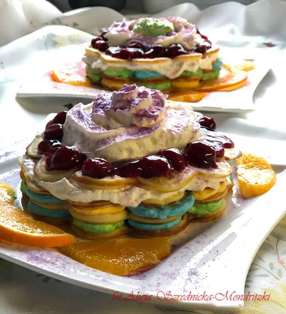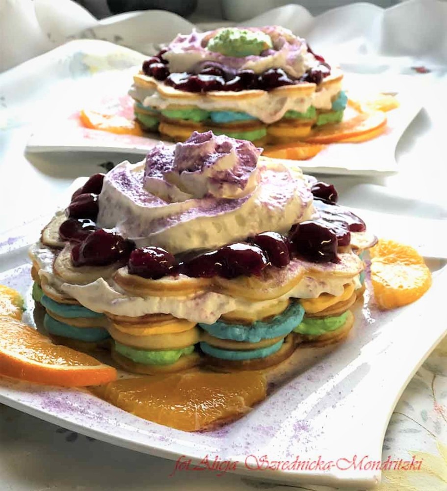 Dodatki to jedna śmietana kremówka ubita na sztywno. Druga śmietana kremówka ubita na sztywno i zmieszana z serkiem Mascarpone oraz 3 łykami cukru. Podzieliłam te serową masę na trzy części i do każdej dodałam inny farbę spożywczą. Na obrzeza kładłam po łyżeczce kolorowych mas a w środek jednego wafla Rote Grütze a na drugi mus jabłkowo-ananasowy i na czubek piramidy aby uwieńczyć dzieło kaloryczne bitą śmietaną i udekorowane wiśniami z Rote Grütze. Naturalnie to jest tylko przykład z czym można zjeść te pyszne wafle, myślę ze je można jeść ze wszystkimi owocami, musami, marmoladami, a i po prostu z cukrem pudrem itp..