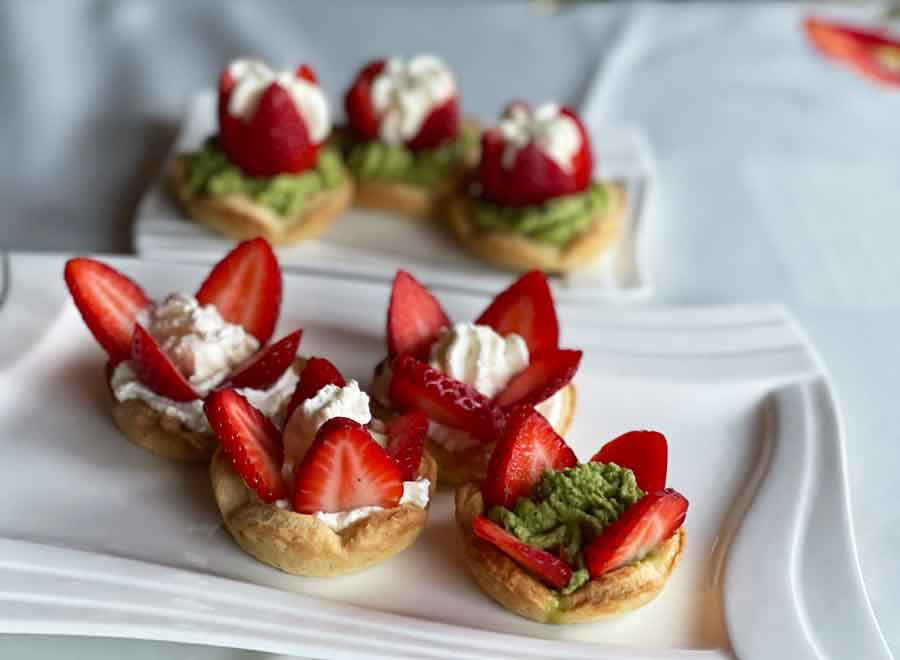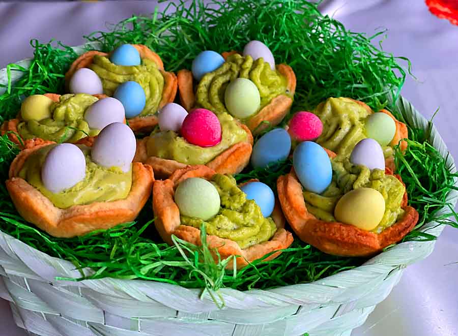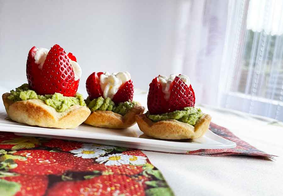Babeczki-kruche-kolorowe, to ciasto typowo kruche wycinane foremką w kształcie kwiatu, wypełnione masą z białej czekolady i śmietany, a cześć także z zieloną herbatą japońską.
