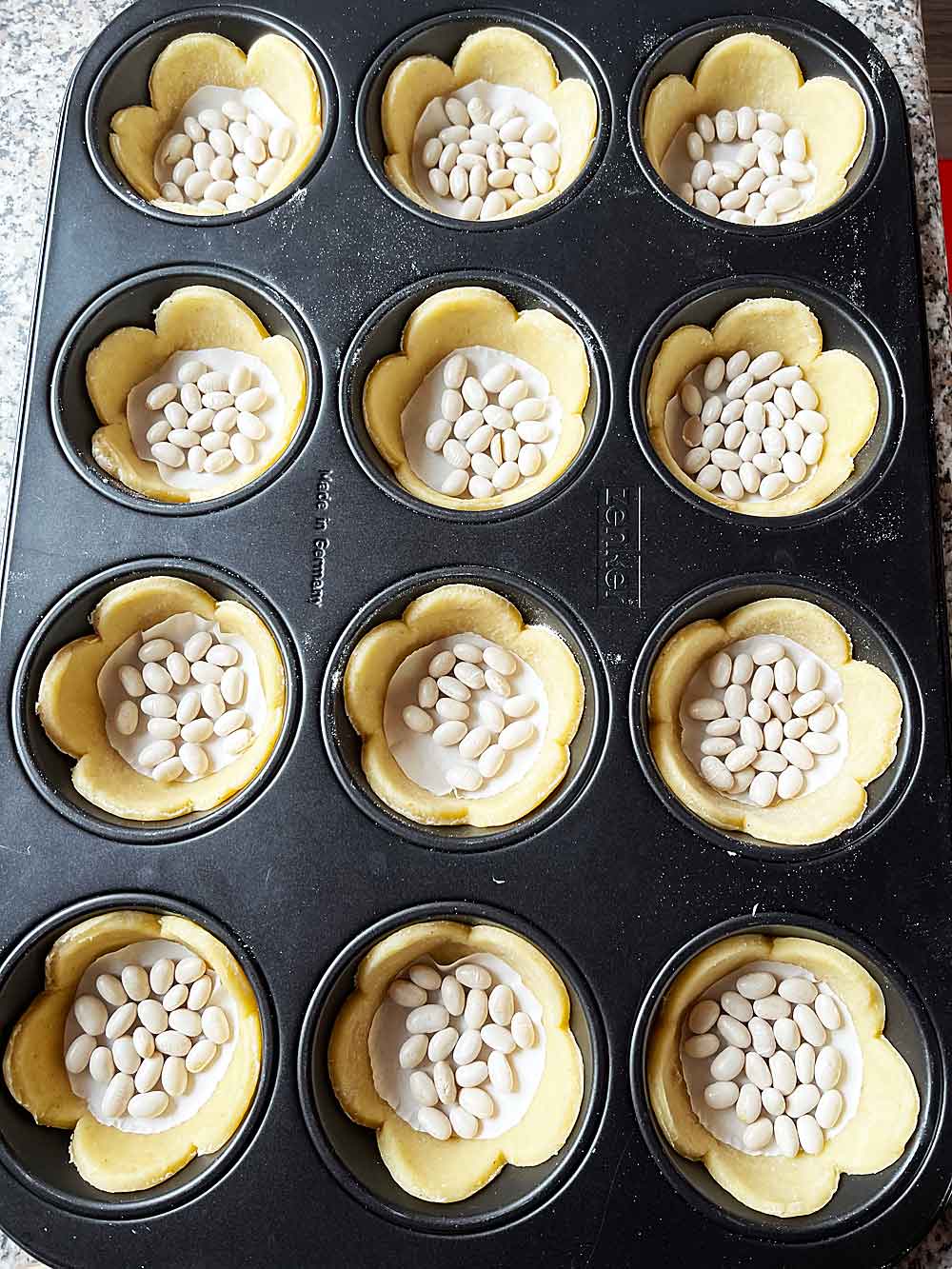 Następnie wycinamy przyrządem o ulubionych kształtach, ja wycięłam spody w kształcie kwiatu. Wciskamy wycięte spody do foremek, nakłuwamy kilkakrotnie i wstawiamy ponownie do lodówki na 30 minut , żeby się potem nie skurczyły. Aby dno babeczki pozostało podczas pieczenia płaskie, musimy wyciąć z foremek papierowych dna i położyć na dna wyciętych kółek czy tez kwiatków. Na ten papierek układamy po kilka gramów obciążających fasolek. Proces ten nazywa się „pieczenie ślepe” .