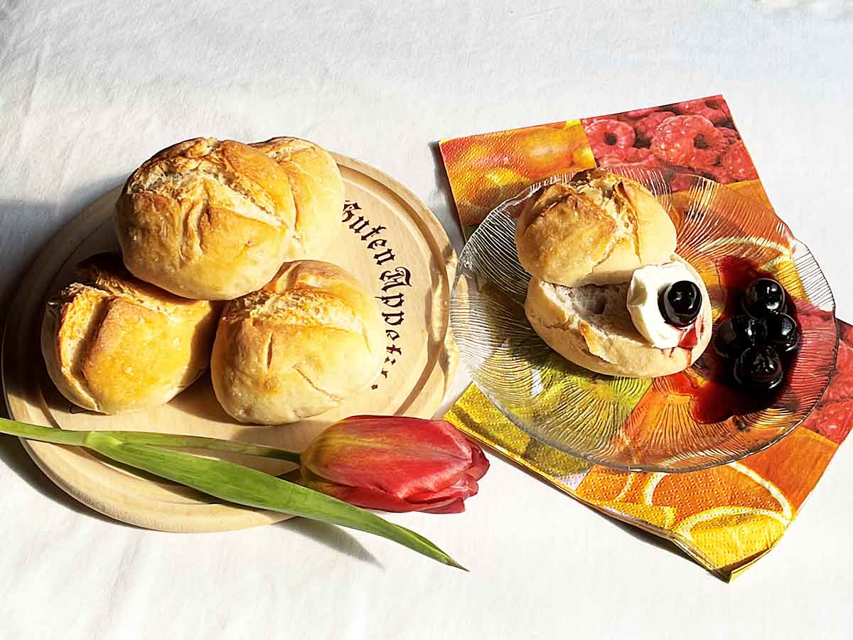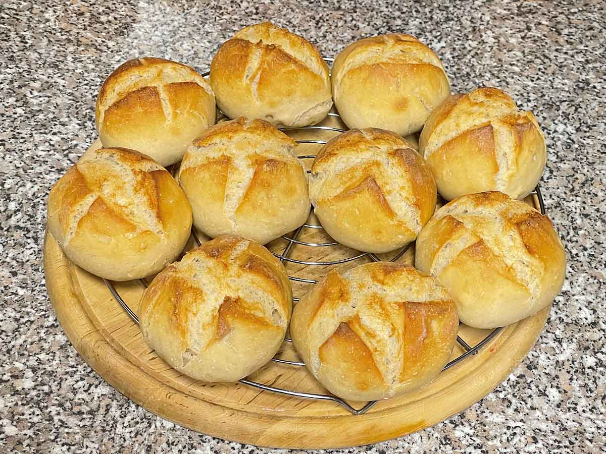 Zostawiamy na 60 minut do wyrośnięcia. Piekarnik rozgrzewamy do 250°C góra-dół. Na bułeczkach nacinamy ostrym nożem lub żyletką znak krzyża i wstawiamy do piekarnika wraz z parującym naczyniem na 1 minutę, po czym wystawiamy naczynie z parą / w przeciwnym razie bułki będą gumowe /, zmniejszamy temperaturę do 220°C i pieczemy nadal 18-20 min na złoty brąz.