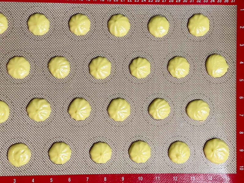 Dwie blachy piekarnika  wykładamy papierem do pieczenia, albo przygotowujemy maty, masę przekładamy do worka plastikowego lub do wyciskarki, do kremów i wyciskamy równe porcje ok.2,5 cm każda. Odstawiamy blaszki w chłodne miejsce na 30 minut do obsuszenia ciastek. Piekarnik nagrzewamy do 150 °C góra/dół i pieczemy po jednej blaszce na środkowej szynie 12-15 minut. Następnie wyjmujemy ostrożnie papier z makaronikami na ruszt kuchenny i zostawiamy do przestudzenia, po czym delikatnie ściągamy je z papieru lub maty.