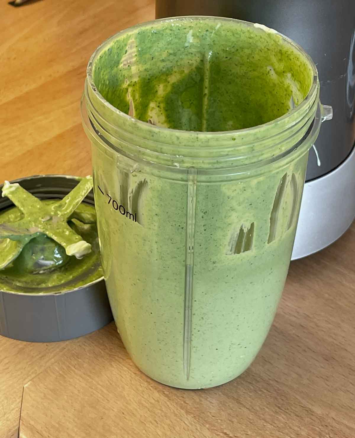 Zioła należy umyć, a następnie odwirować do sucha, w przeciwnym razie sos będzie zbyt wodnisty. Mikser do tego jest w porządku, ale ja zrobiłam innym przyrządem bardzo miałko . Jeśli widać drobne cząstki listków, lepiej prezentuje się na talerzu. Obie opcje są w końcu poprawne. Wystarczy zgrubnie posiekać zioła, aby łodygi nie owijały się już wokół noża miksera, albo zsunąć drobne listki palcami z łodyżek i tylko te użyć. Włóż wszystko do miksera i gotowe. Zioła błyskawicznie zamieniają się w pyszną, płynną zieleń.
