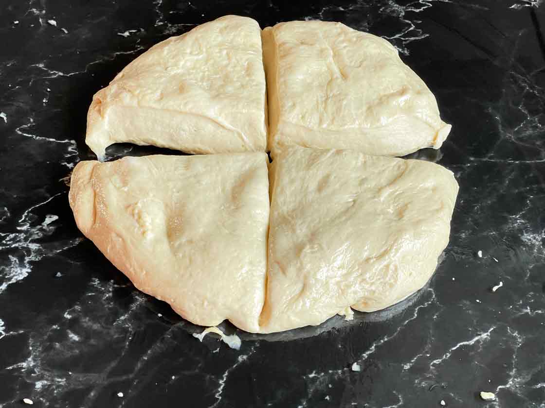 Ciasto wyłożyć na powierzchnię posmarowana odrobinę olejem i podzielić na 4 części.