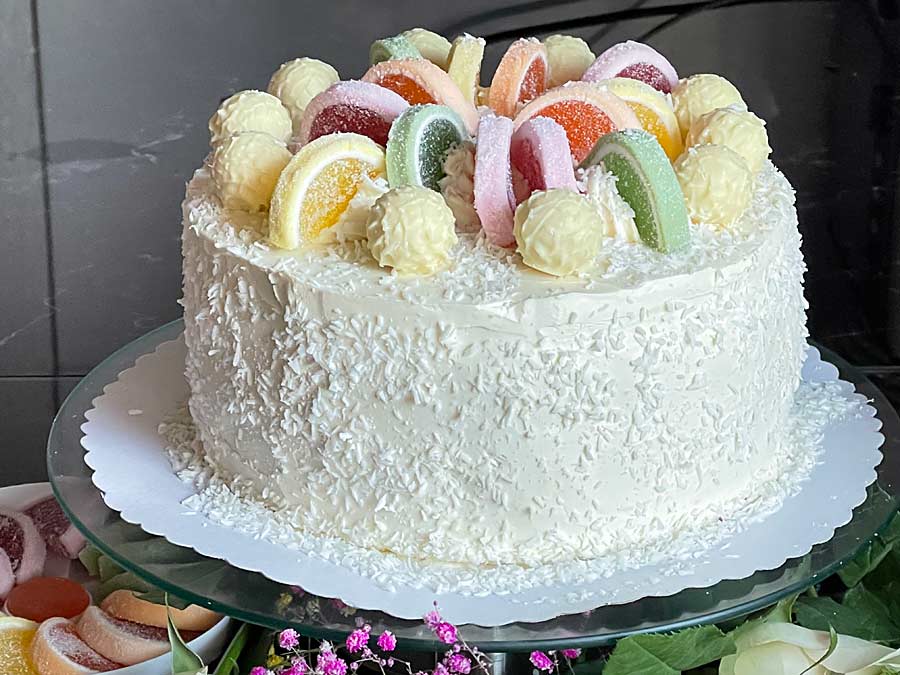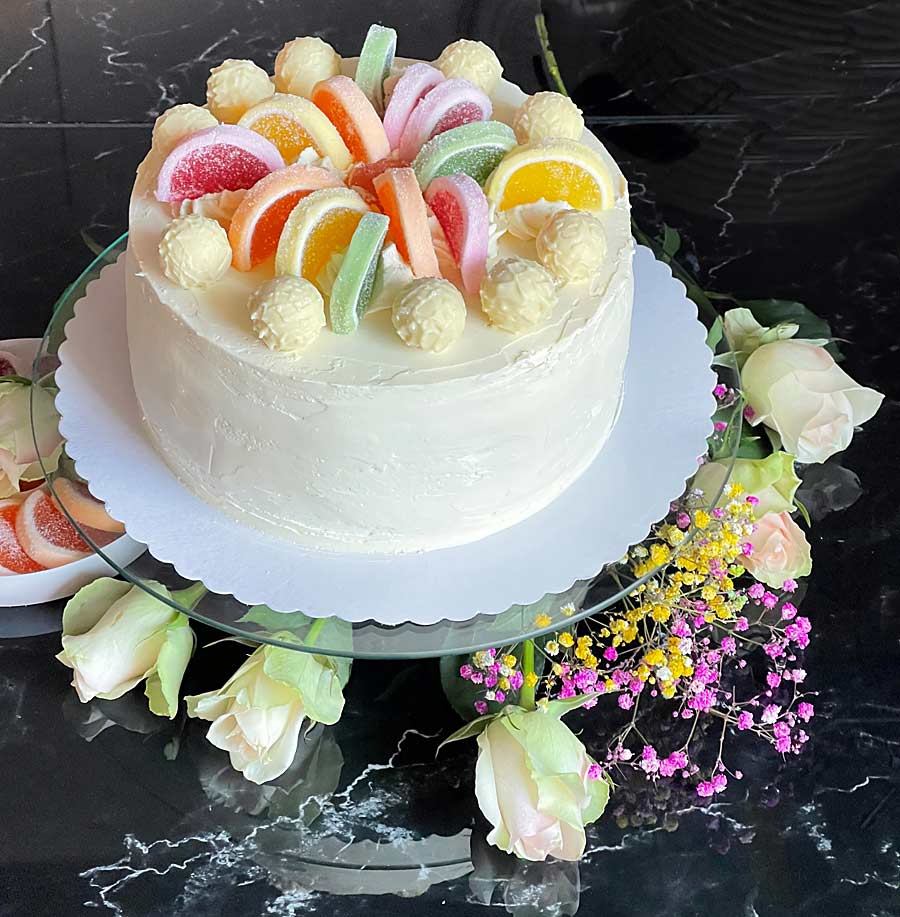 White cake  jako tort. Tort się nie zapada, masa się nie wylewa, wszystko dobrze przebiegło i działa  jak w przysłowiowym szwajcarskim zegarku. To jest najpiękniejsze ciasto i sprawiło mi  wiele radości  jego tworzenie jak żadne inne.Tego i Wam życzę – smacznego!