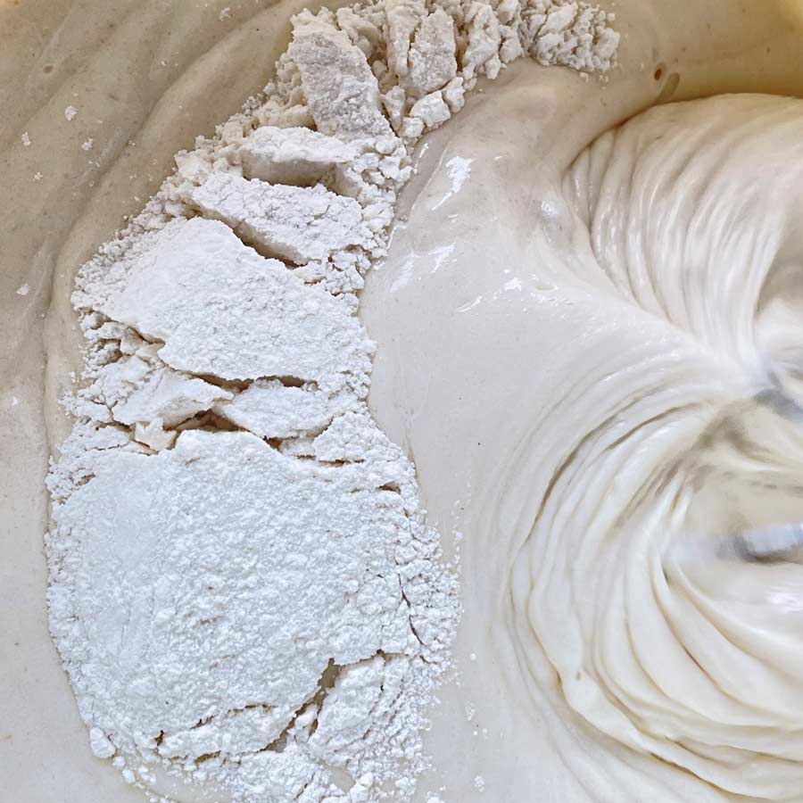 Mikserem na średnich obrotach stopniowo, naprzemiennie dodawaj mąkę i mleko do masła, zaczynając i kończąc na mieszance mącznej. Mieszaj, aż każda porcja będzie prawie całkowicie połączona, zanim dodasz następną.