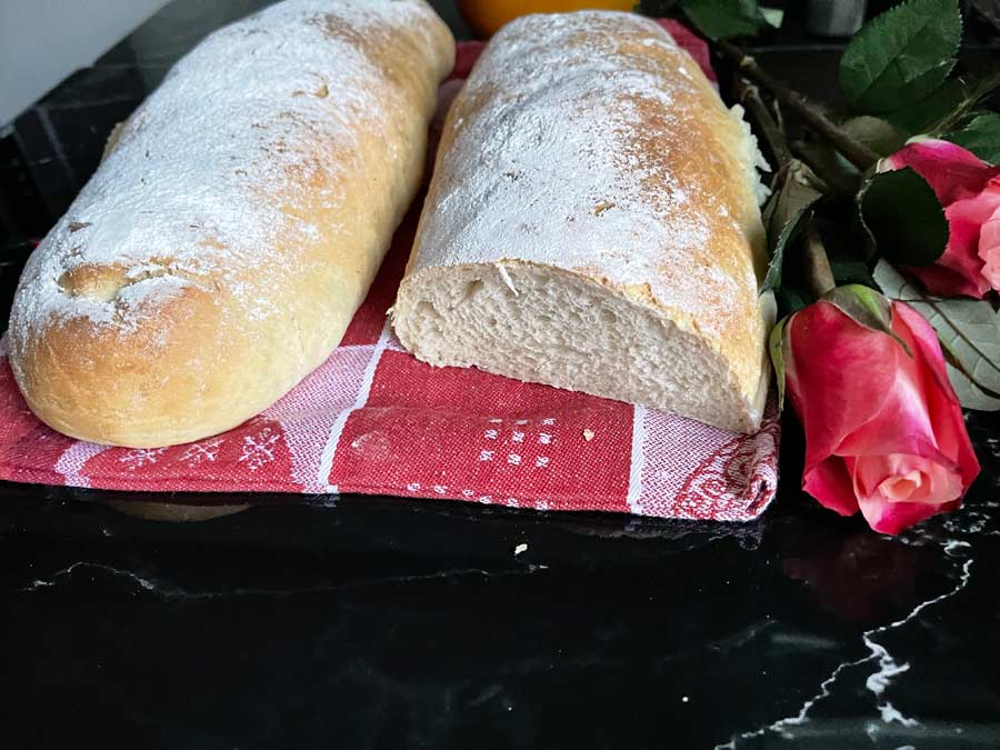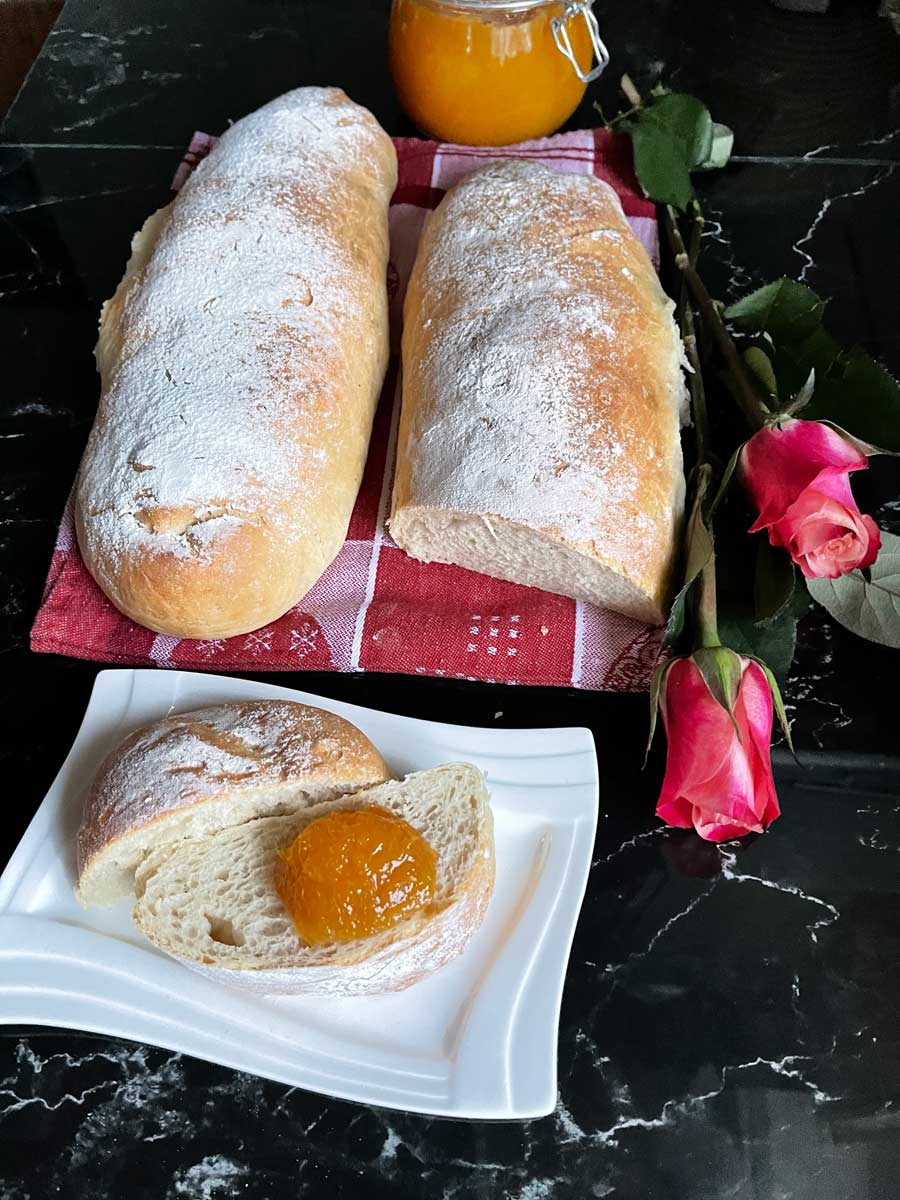 4. Wyrośnięte sztuki chleba posypać widocznie mąką przez sito i wstawić do piekarnika na środkową szynę, chlusnąć szybko szklankę wody na dol piekarnika i zamknąć, po 5 minutach otworzyć piekarnik i wypuścić parę, piec dalej 15-17 minut, łączny czas pieczenia 20-22 minuty.