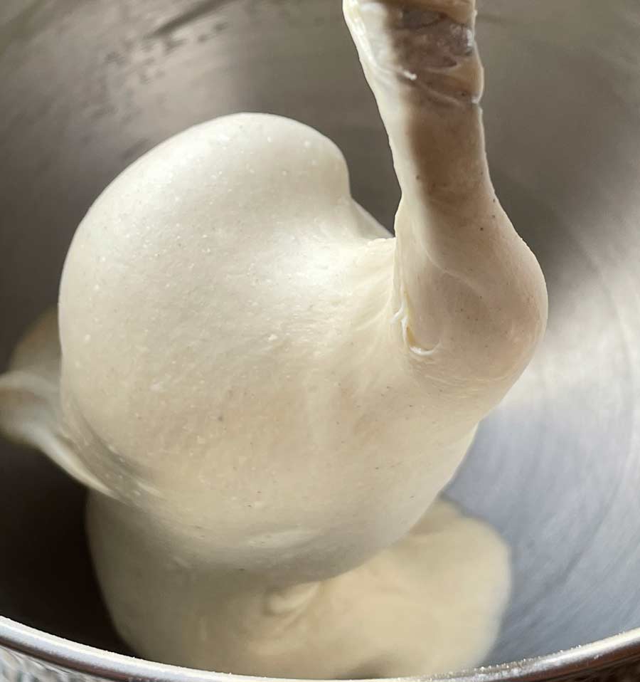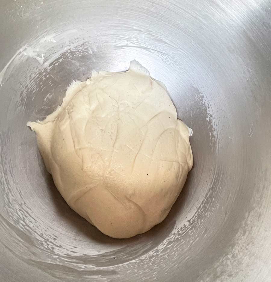 1.Wszystkie składniki wymieszać w misce robota kuchennego i na najwyższych jego obrotach 10 minut zagniatać. Ciasto uformować w kulę i włożyć do lekko posmarowanej oliwa z oliwek miski, przykryć ściereczka i zostawić na 120 minut do wyrośnięcia, ale po 60 minutach porządnie przegnieść ciasto i znów przykryć.
