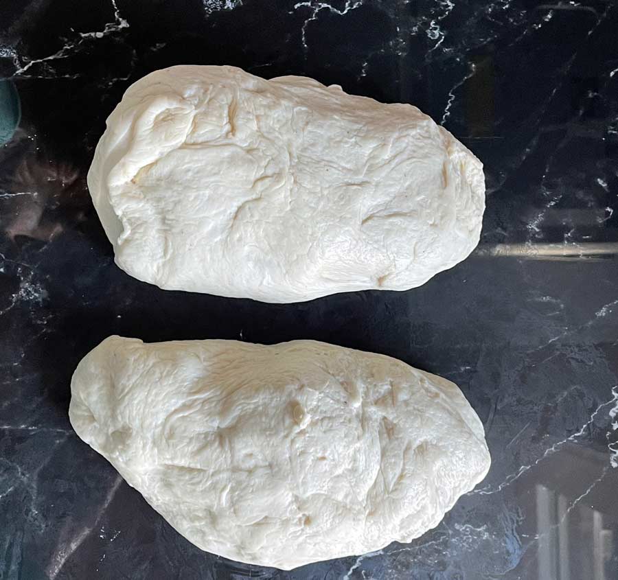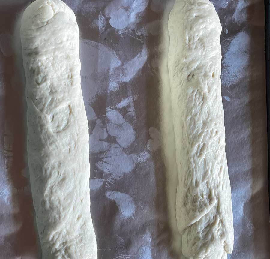 2. Ciasto podzielić na dwie równe części każda ok.350 g i zwinąć 2 długie rulony. Zostawić na 120 minut do wyrośnięcia.