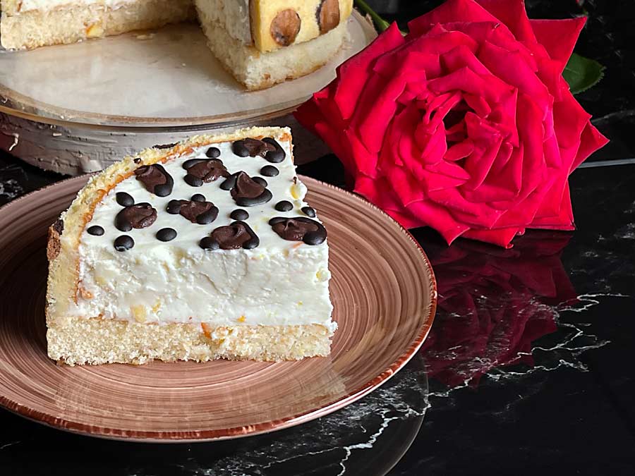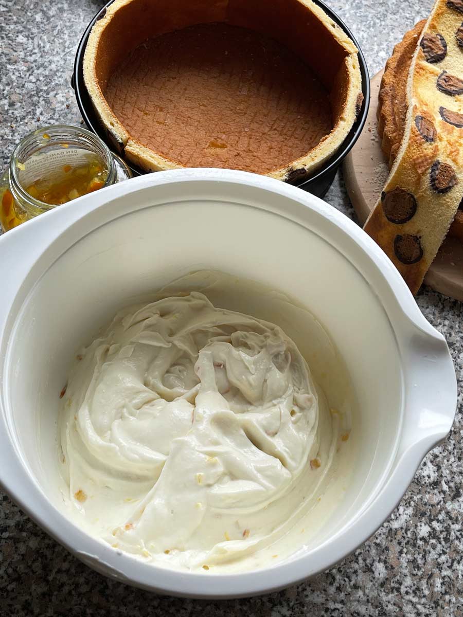 5 Masa serowa z serka podwójnie śmietankowego, lub Mascarpone: najpierw ubić śmietanę na sztywną pianę. Następnie mikserem ręcznym wymieszać serek śmietankowy z cukrem i syropem pomarańczowym. Namoczoną i wyciśniętą żelatynę rozpuść w ciepłym mleku. Dodaj śmietanę i dodaj oba składniki do masy z serkiem śmietankowym. Teraz wymieszaj kandyzowane kawałki pomarańczy.