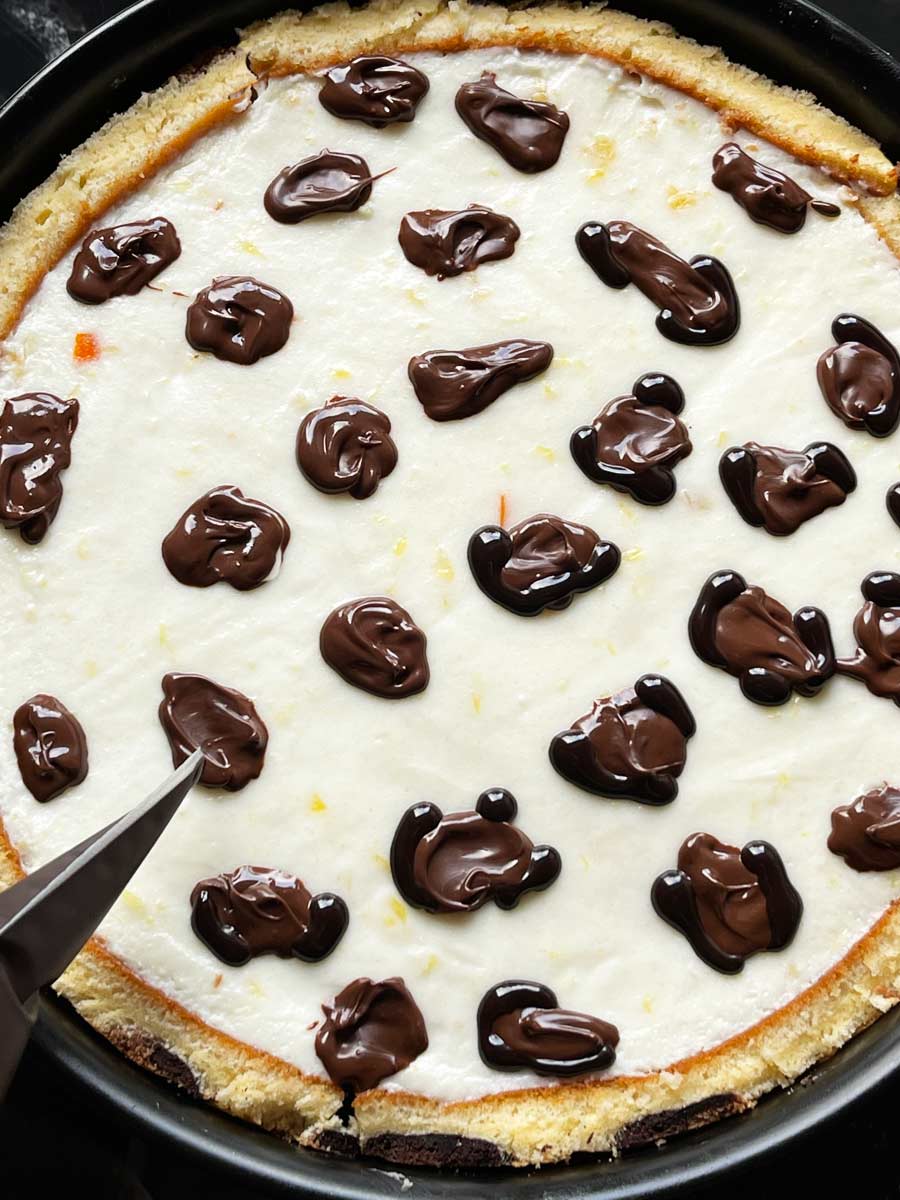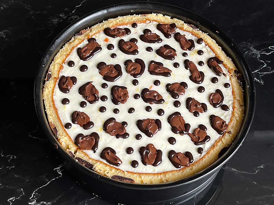 7 Wisienką na torcie jest ten sam wzór lamparta na kremie serowo- śmietankowym. W tym celu włóż każdą z roztopionych czekolad do rękawa do szprycowania i namaluj nim wzór na torcie podobnie jak przy biszkopcie. (zdjęcia na dole).