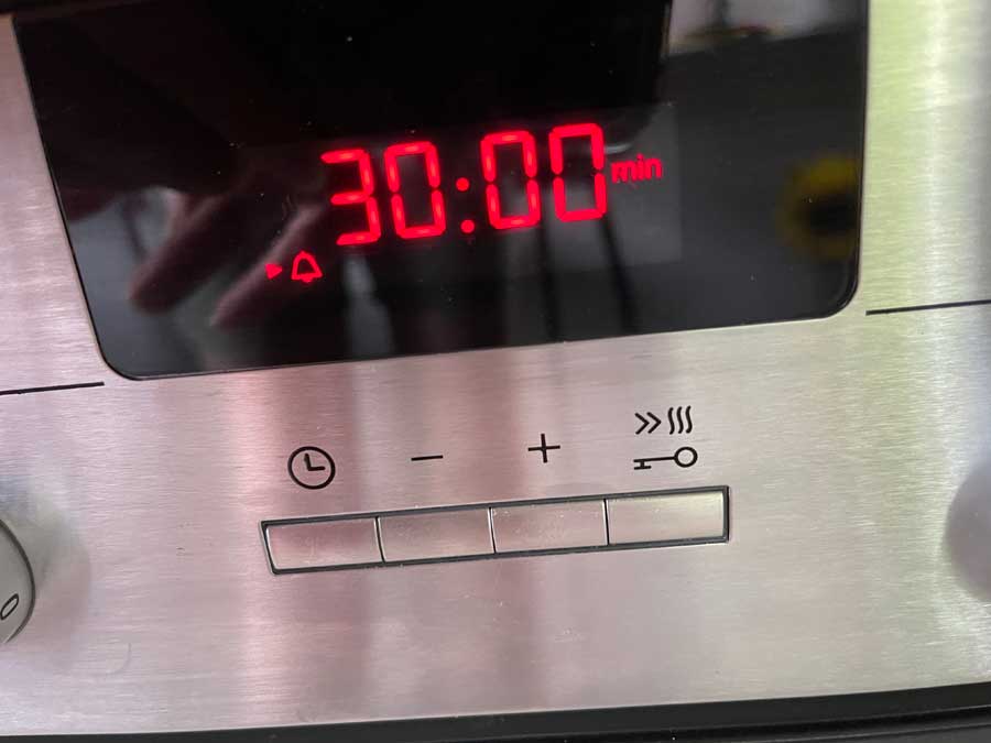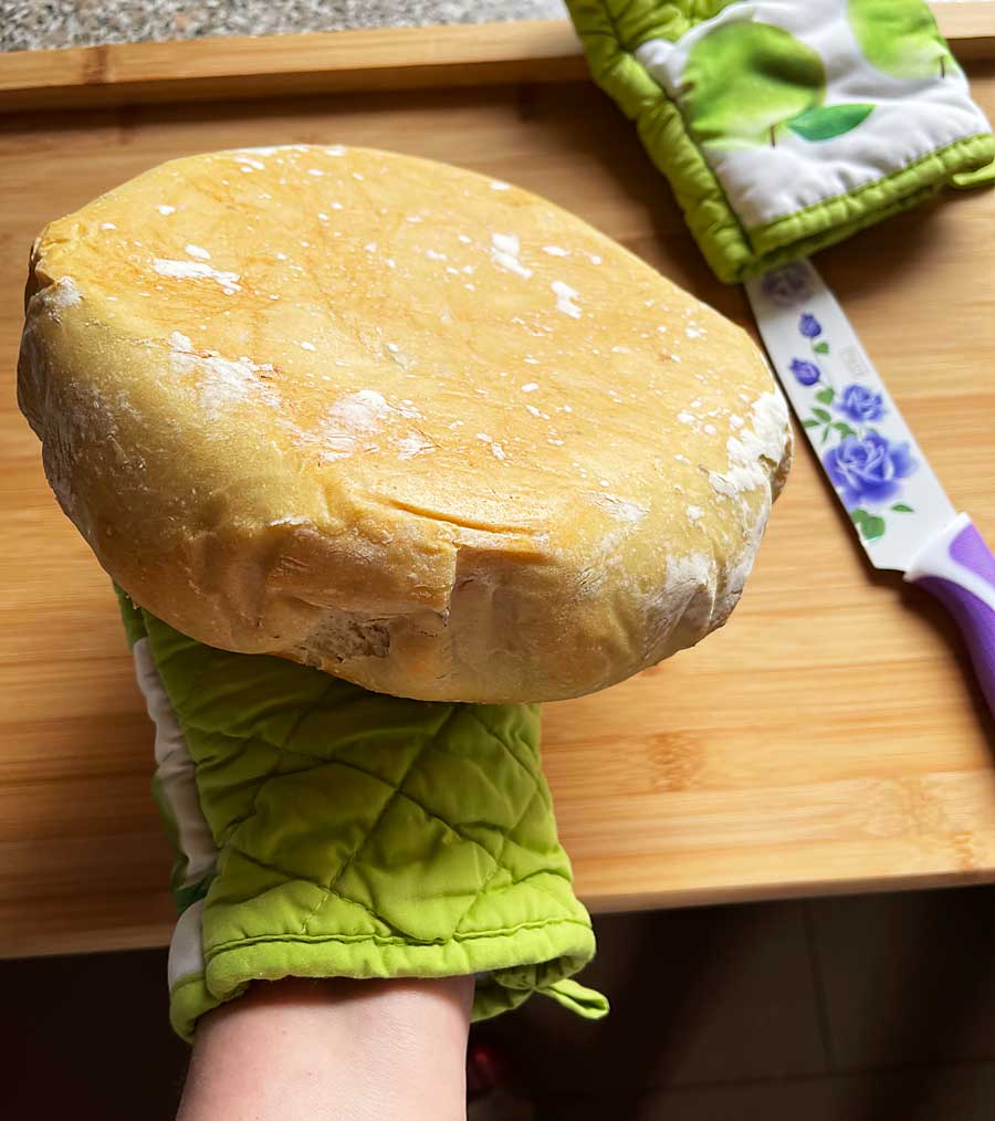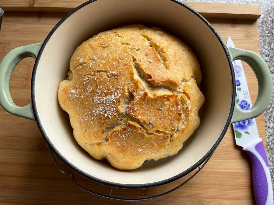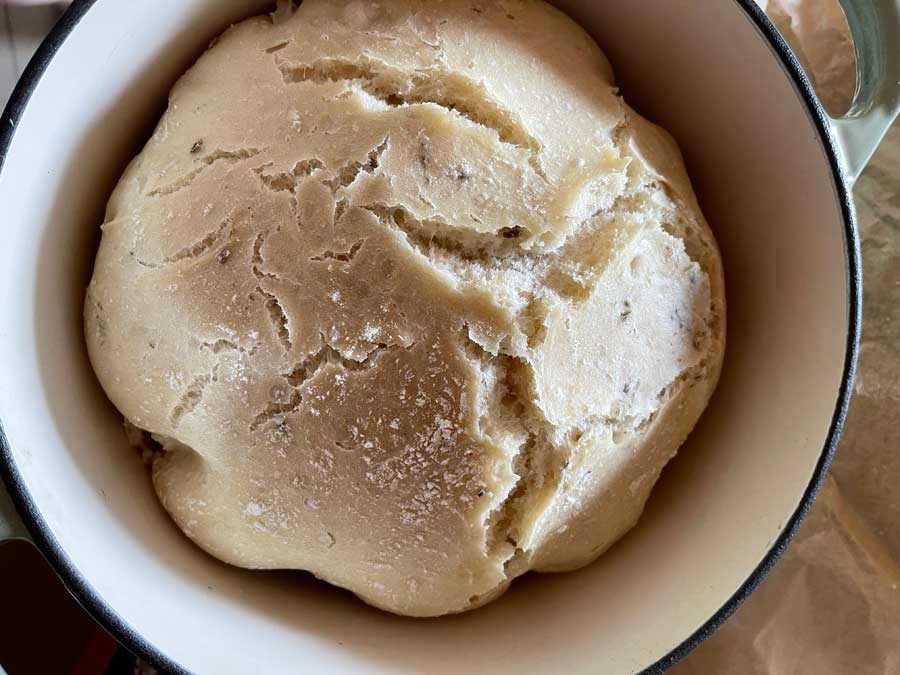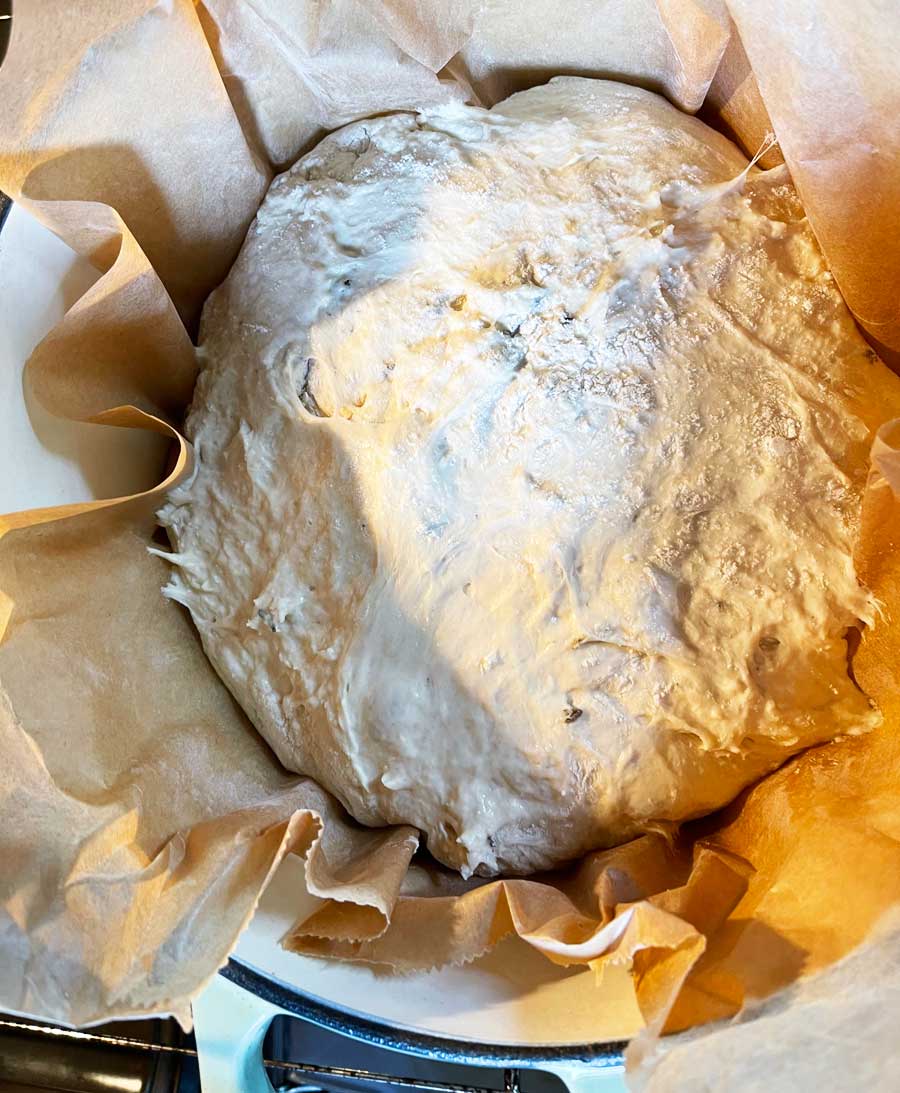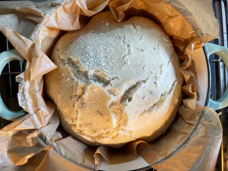 Ciasto wraz z papierem wkładamy do rozgrzanego garnka i przykrywamy. Pieczemy 30 minut, po czym wystawiamy garnek z piekarnika i sprawnie wyjmujemy chlebek z papieru i wrzucamy go ponownie do odkrytego garnka i pieczemy 30 minut./bez pokrywy/.
