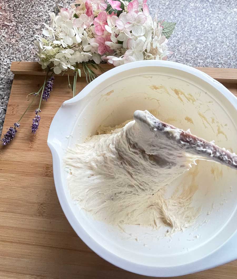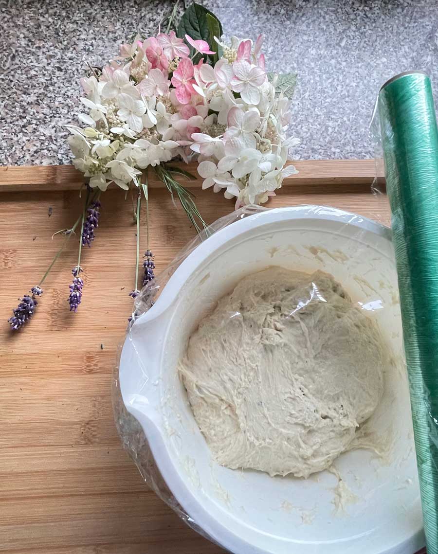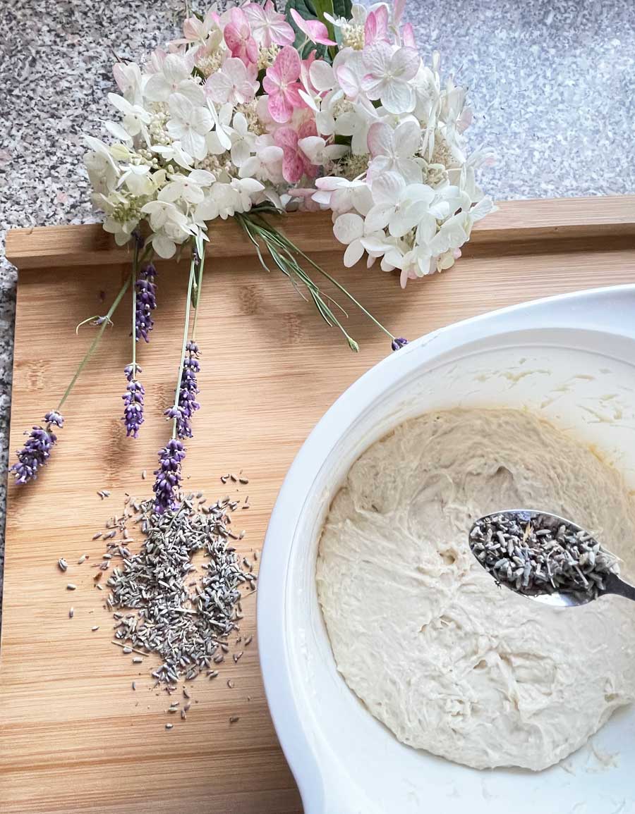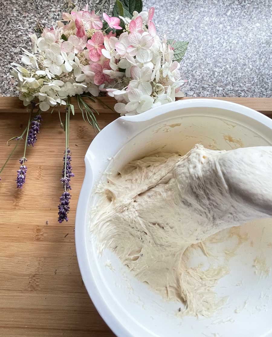 Drożdże wrzucamy do miseczki, rozpuszczamy w części ciepłej wody, dodajemy 150 g mąki, mieszamy i przykrywamy folią na 15 minut, aby znacznie uniosły się w górę. Następnie wlewamy drożdże do pozostałej mąki, dodajemy sól, lawendę i resztę bardzo ciepłej wody ca.45°C.