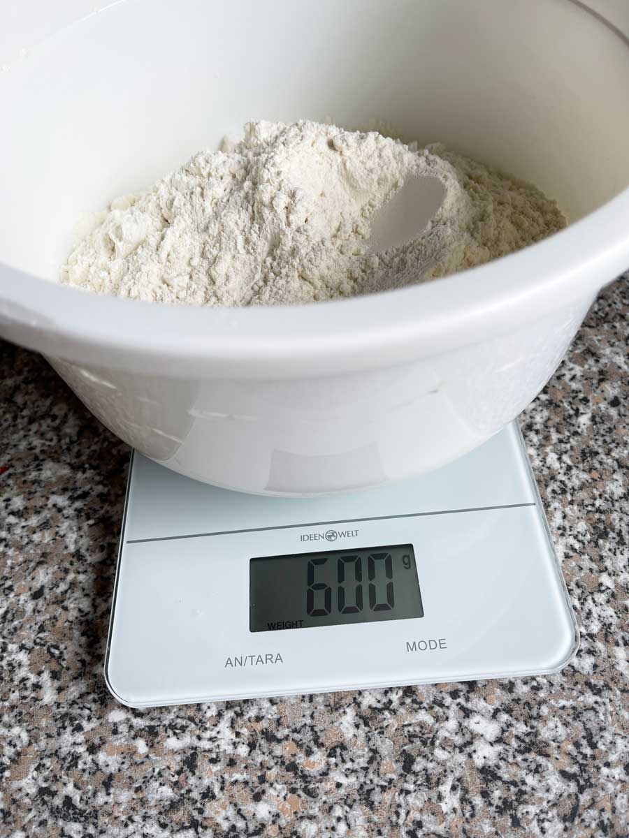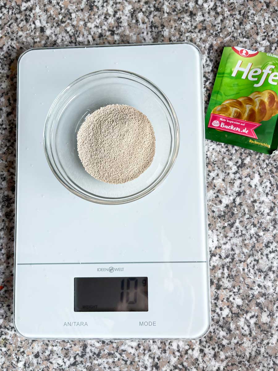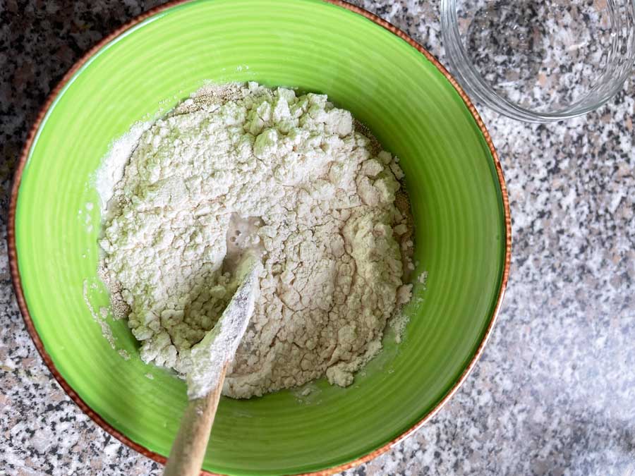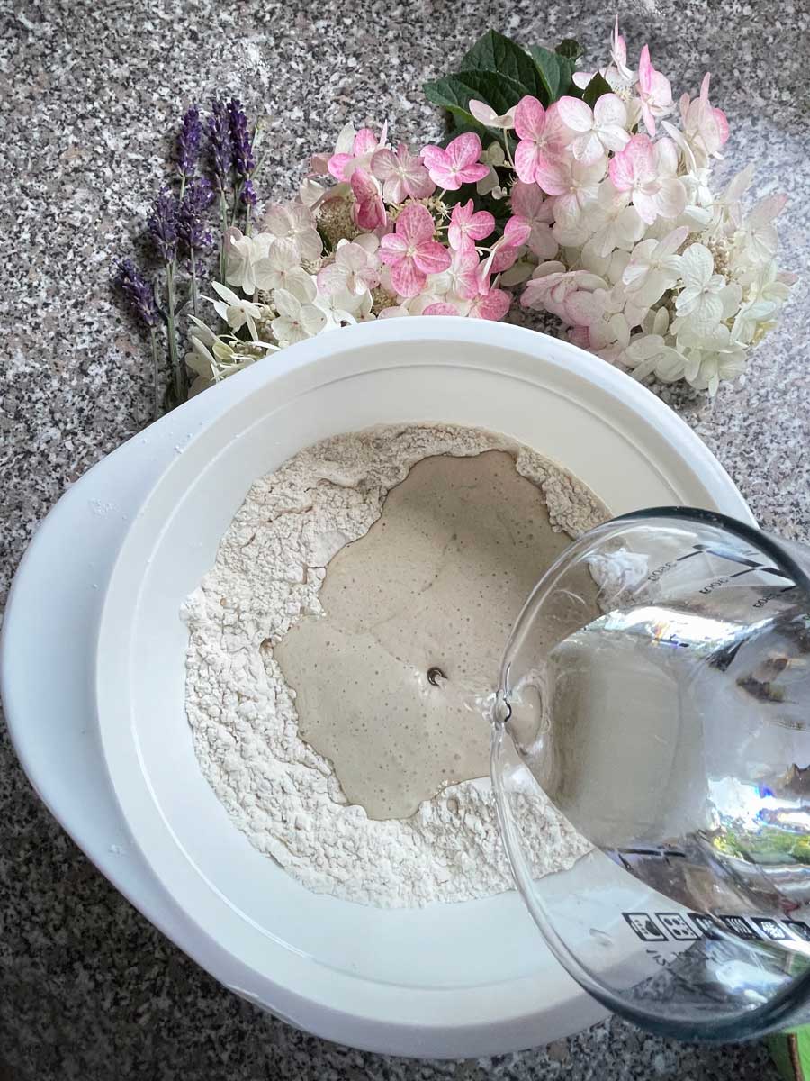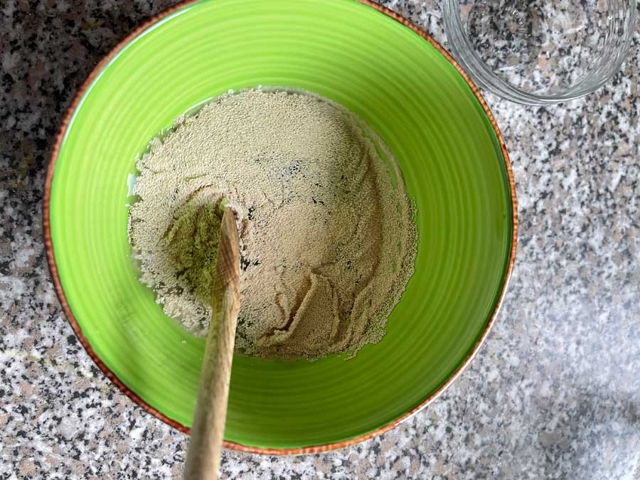 Drożdże wrzucamy do miseczki, rozpuszczamy w części ciepłej wody, dodajemy 150 g mąki, mieszamy i przykrywamy folią na 15 minut, aby znacznie uniosły się w górę. Następnie wlewamy drożdże do pozostałej mąki, dodajemy sól, lawendę i resztę bardzo ciepłej wody ca.45°C.