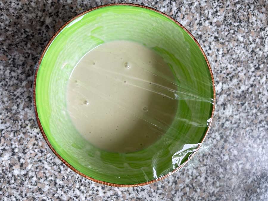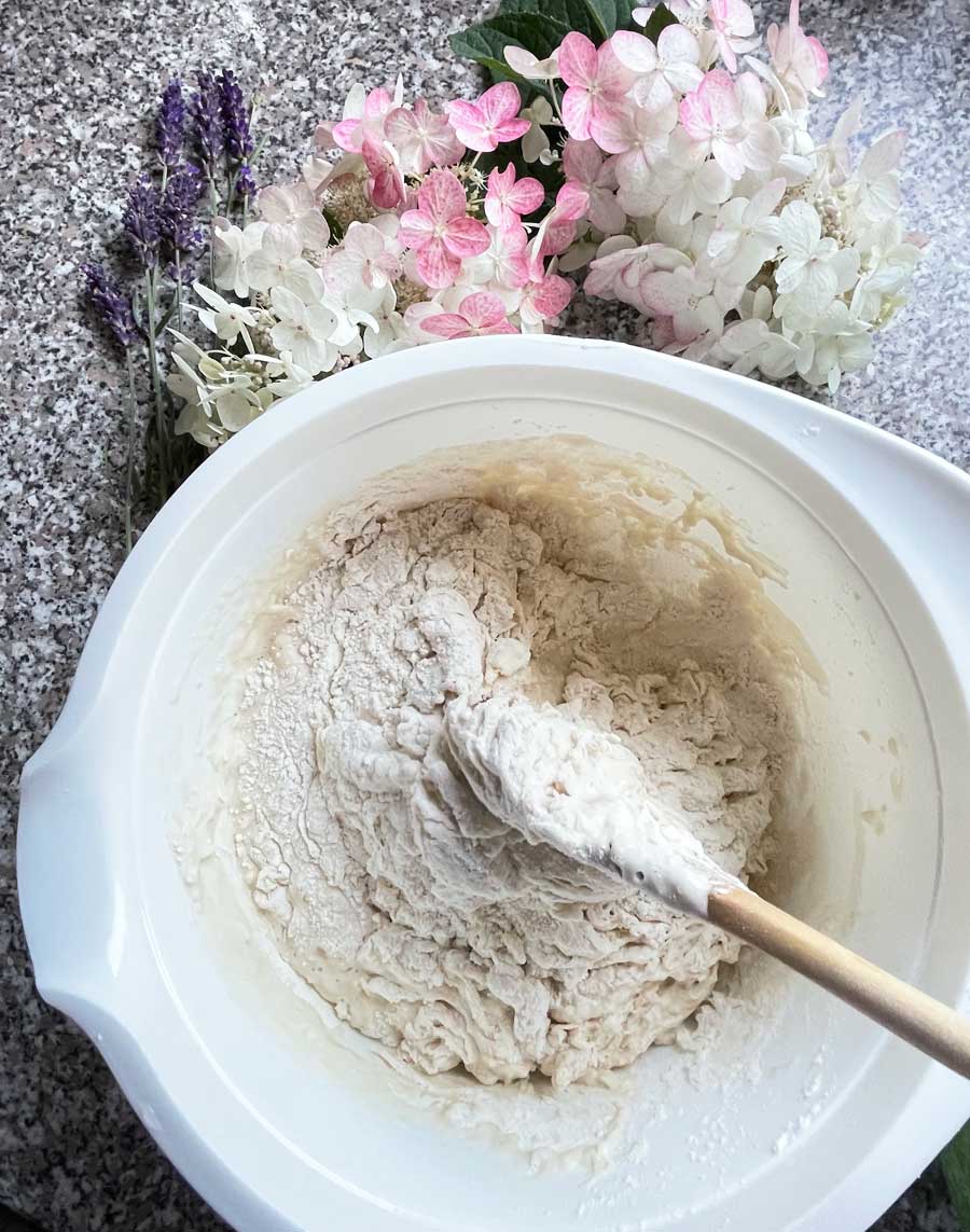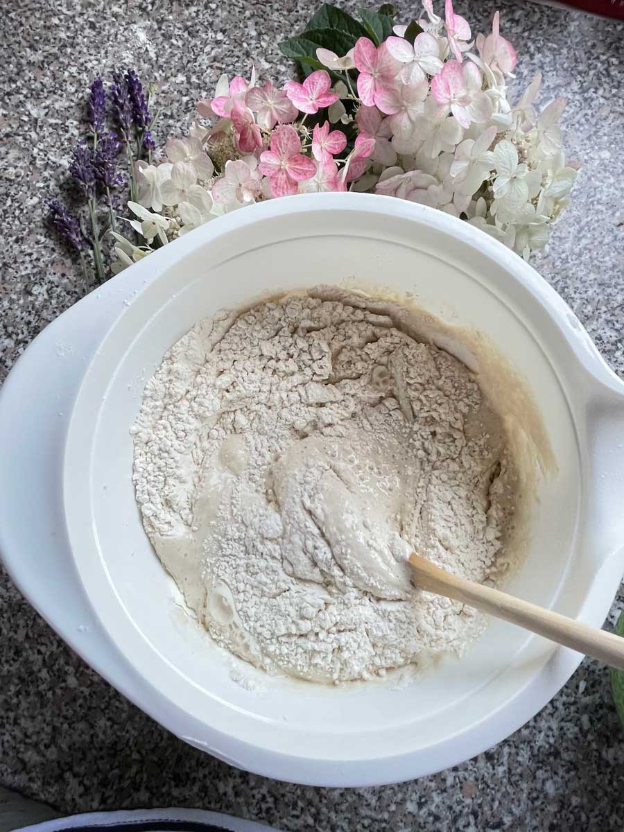 Mieszamy drewnianą łyżką, aż ciasto zacznie odstawać od miski, ale będzie wciąż luźne, takie ma być. Przykrywamy ciasto i odstawiamy w ciepłe miejsce do wyrośnięcia.