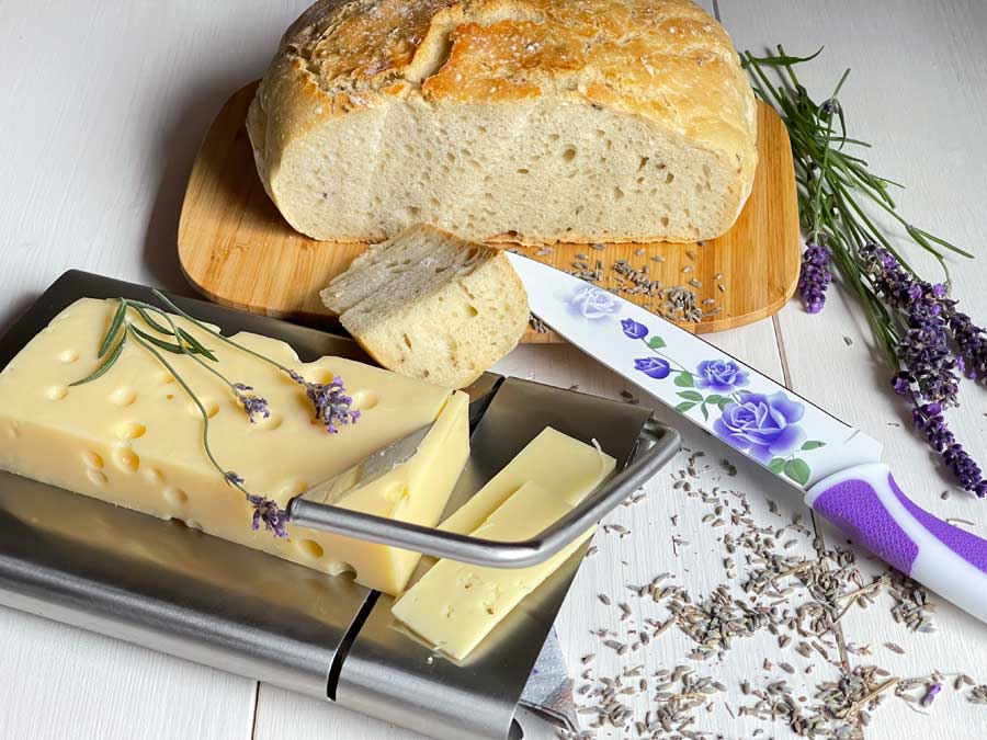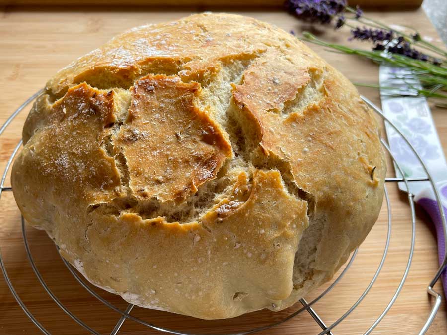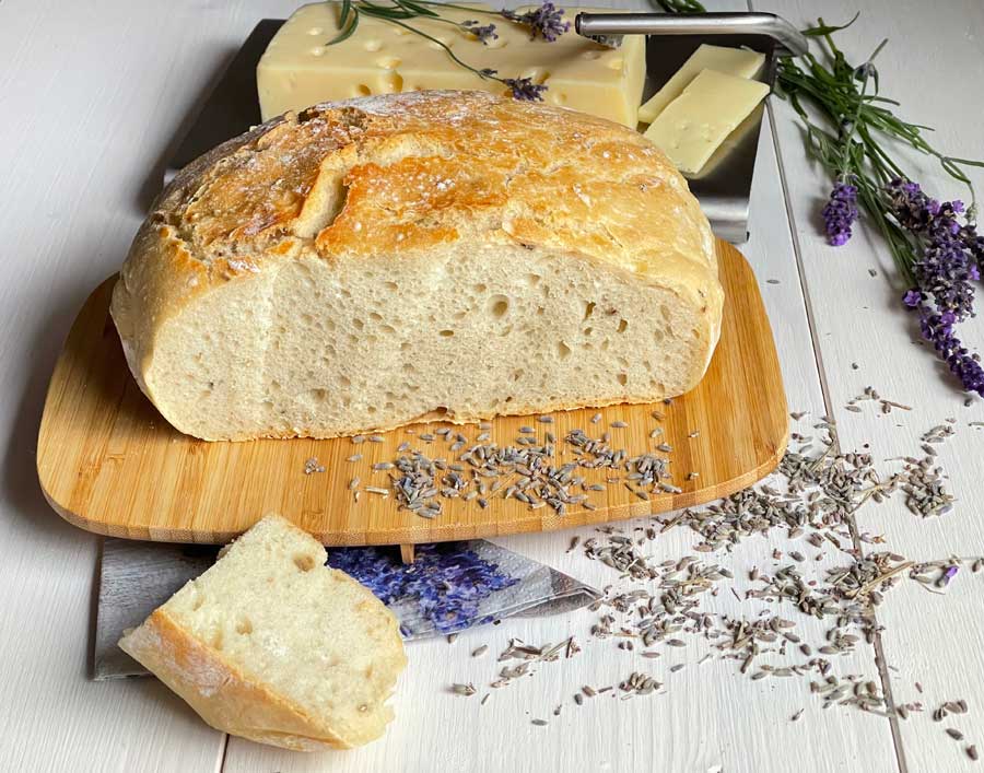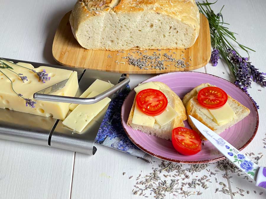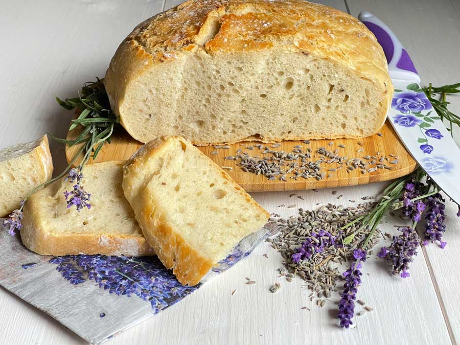 Chleb biały z lawendą to wyjątkowo aromatyczny chlebek, uginający się w palcach jak gąbka, z dużymi dziurkami co oznacza, że nie zaistniały przeszkody w procesie jego garowania i wypiekania. Do jego wypieku najlepiej użyć dobrej jakości mąkę i nie przedłużać czasu jego wyrastania. Mimo, ze receptura nie jest skomplikowana należy jednak zachować wszystkie zalecenia. Jednakże typy mąki pszennej można mieszać umiarkowanie, tylko przy mące żytniej należy zachować proporcje zalecane, czyli nie więcej niż 20%. Naturalnie dodając mąkę żytnią uzyskamy już inny, różniący się chleb od tego, ale równie smaczny. Bardzo polecam ten chlebek ze względu na jego wyjątkowy smak, zapach i wygląd, jest naprawdę chrupiący i pyszny.