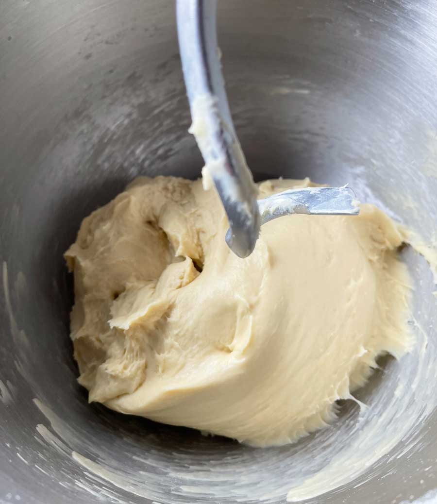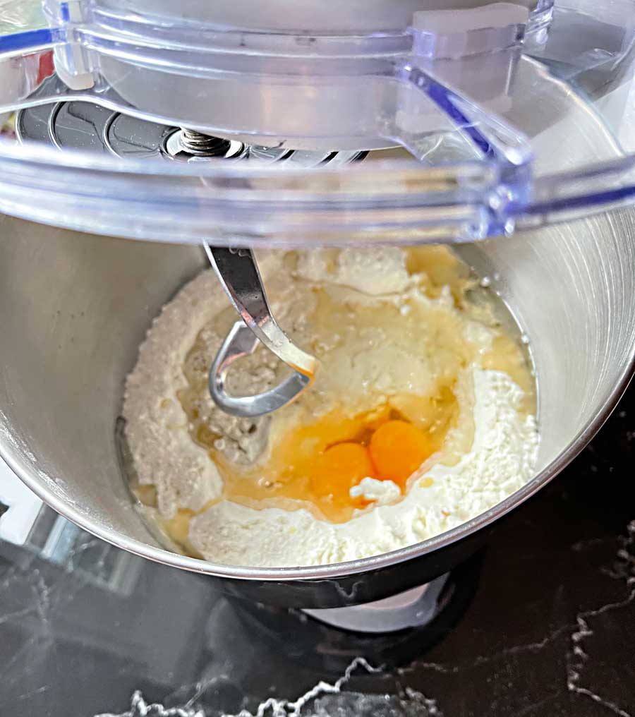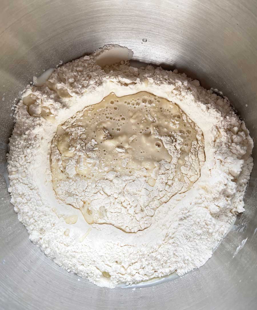 3. Następnie dodaj jajka, sól i olej do ciasta wstępnego w misce i mieszaj wszystko hakiem na ręcznym mikserze, aż ciasto będzie gładkie. Przykryj i odstaw ciasto w ciepłe miejsce na około 2 godziny.