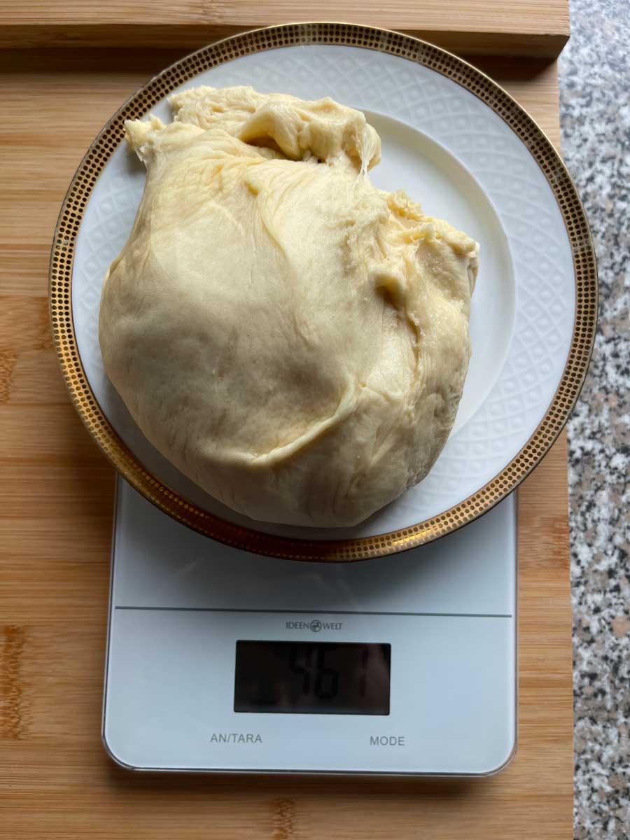 4. Wyrośnięte ciasto podzielić na dwie części o wadze ok. 450 g (foto. 2). Następnie odłóż pozostałe ciasto na razie pod przykryciem.