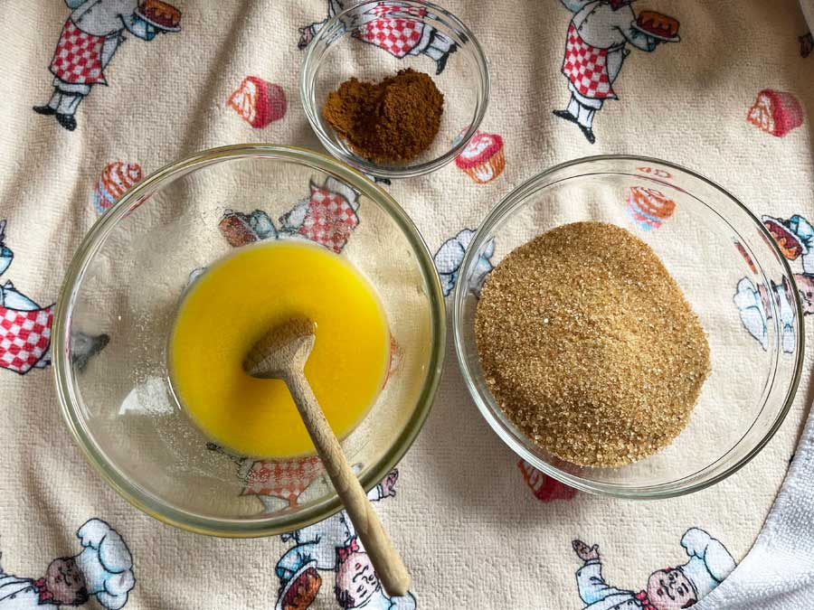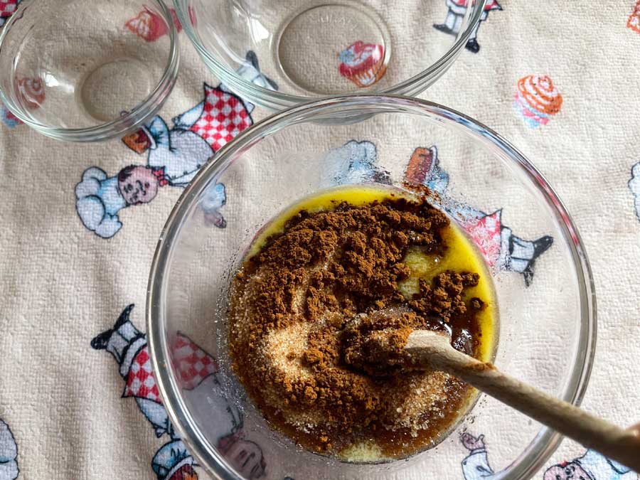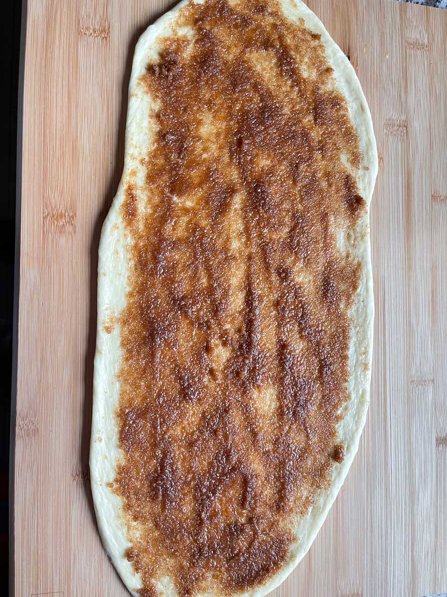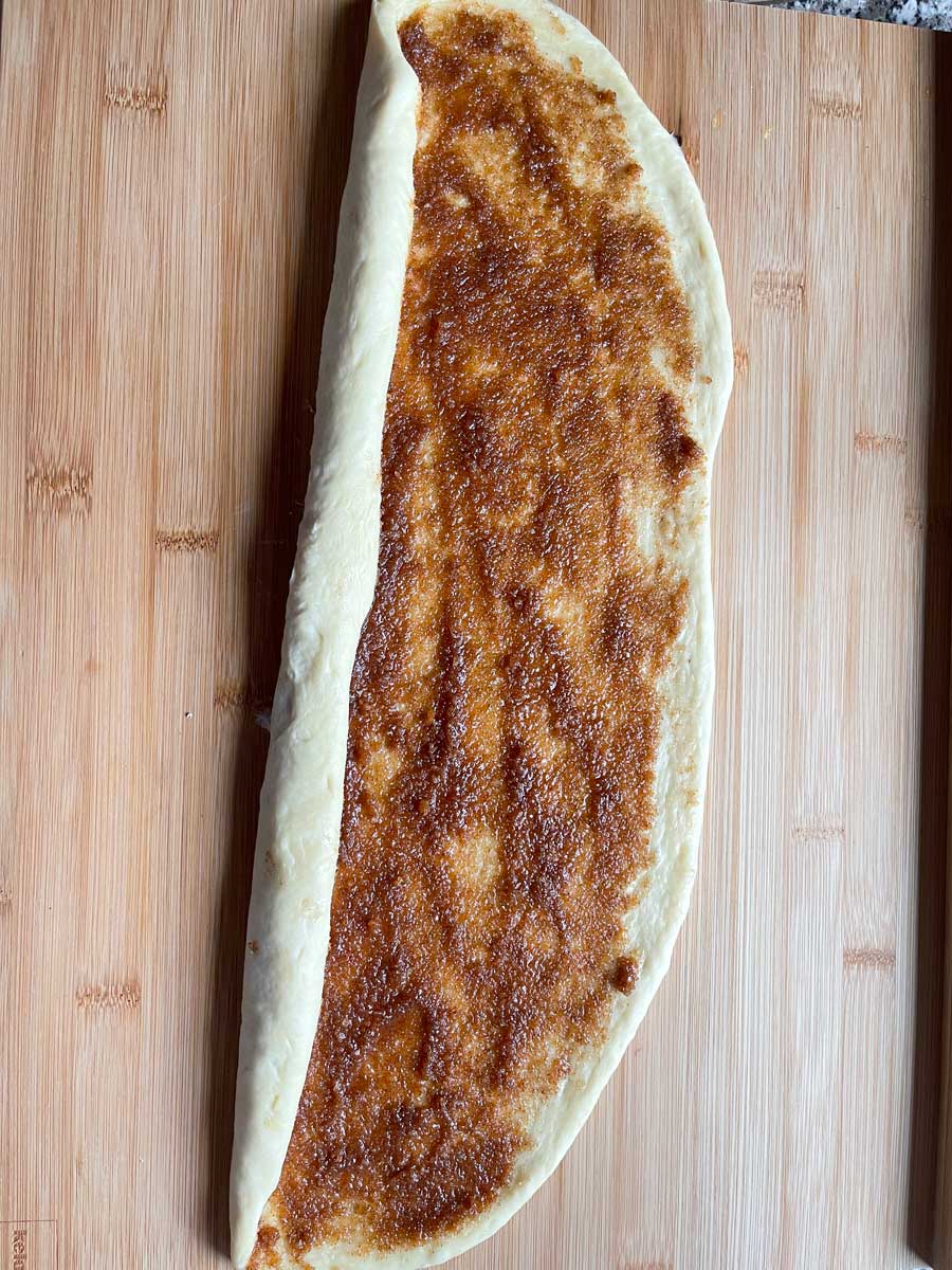 5. Do nadzienia: roztopić masło w rondelku lub w kuchence mikrofalowej i dodać cukier oraz cynamon. Wszystko dobrze wymieszaj. Oba kawałki ciasta rozwałkować wzdłuż i posmarować około 3/4 nadzienia cynamonowego (zdjęcie 3).