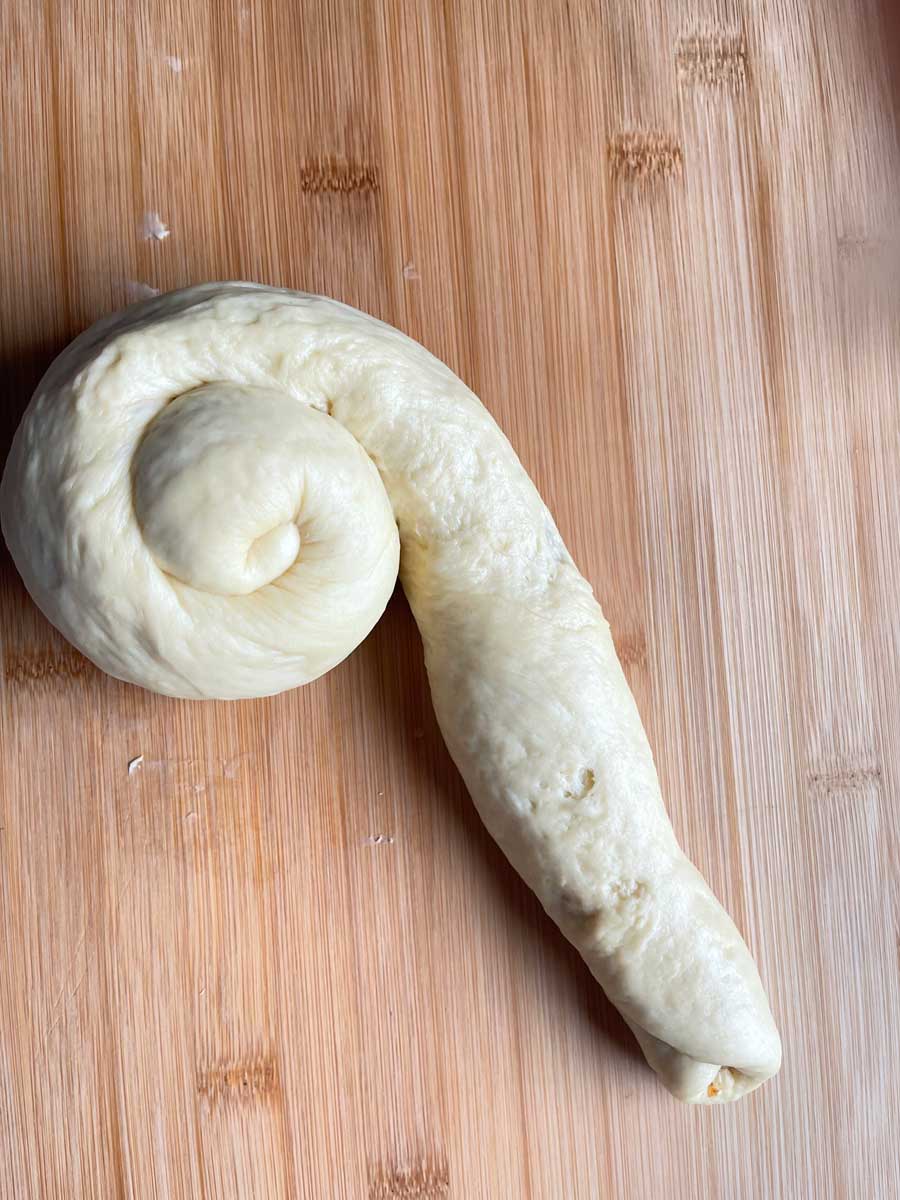 6. Uformuj ciasno kawałki ciasta z dłuższego boku w długiego węża (zdjęcie 4), a następnie zwiń je w spirale w kształcie ślimaka (zdjęcie 5).