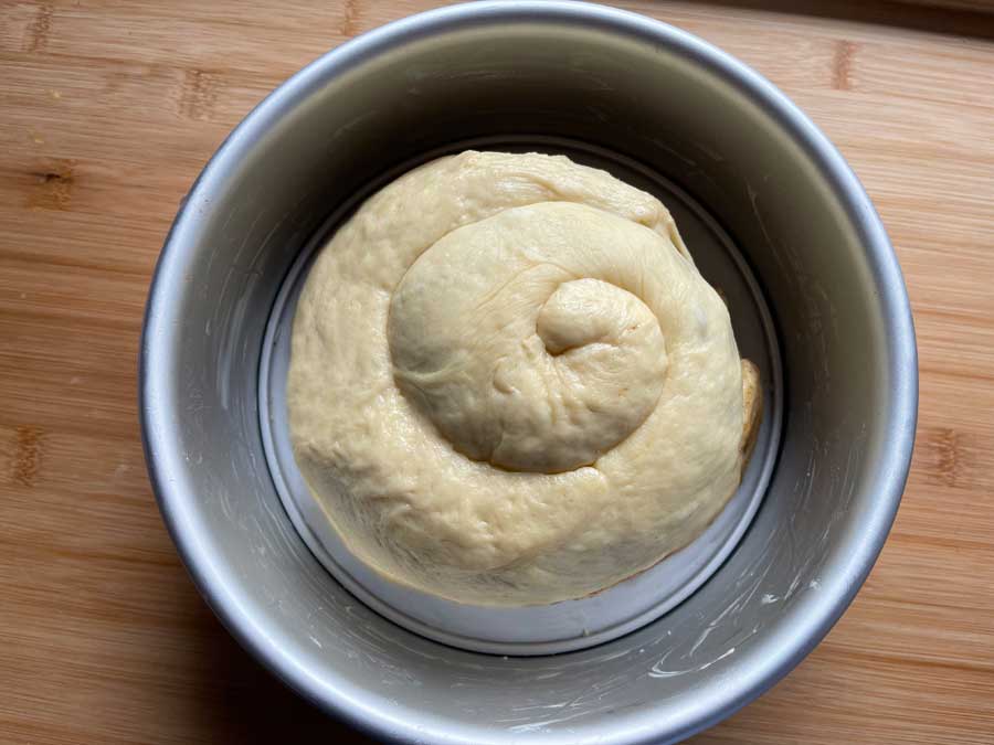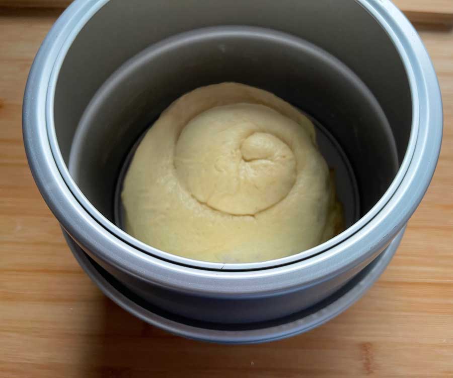 8. Następnie ułóż dwa ciasta ślimakowe jeden na drugim w foremce. Pierścień drugiej tortownicy nałożyć na pierwszą, tworząc wyższą krawędź. Niech ciasto ponownie wyrośnie przez 20-30 minut. Następnie posmaruj ciasto mlekiem i piecz wszystko przez około 50 minut w nagrzanym piekarniku (piekarnik z termoobiegiem: 180°C).