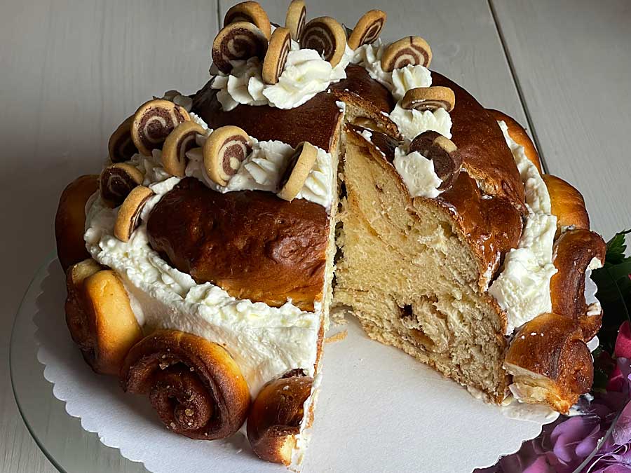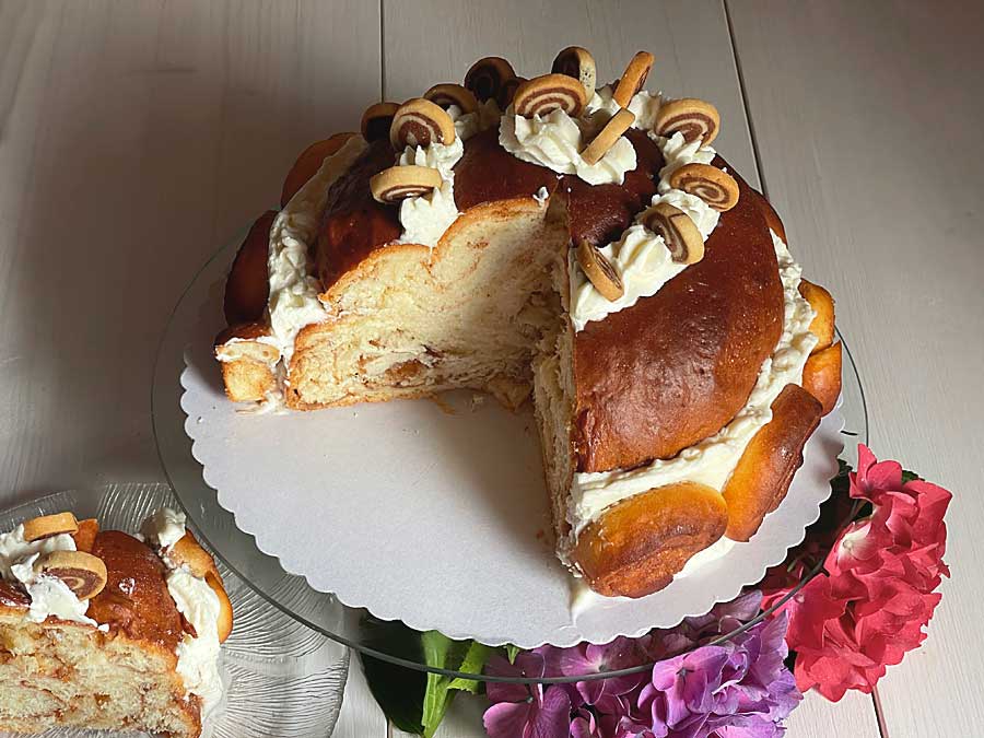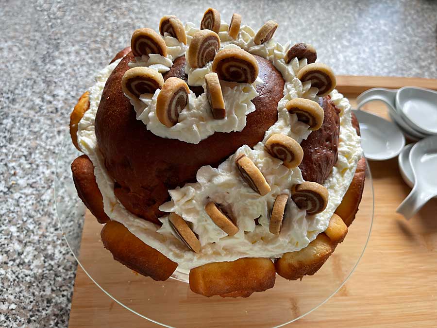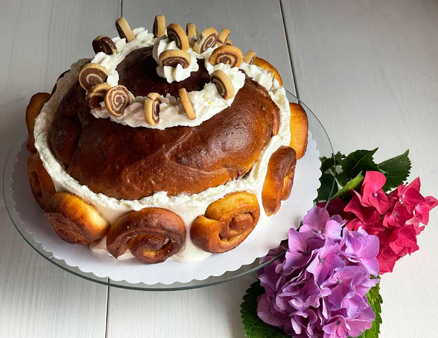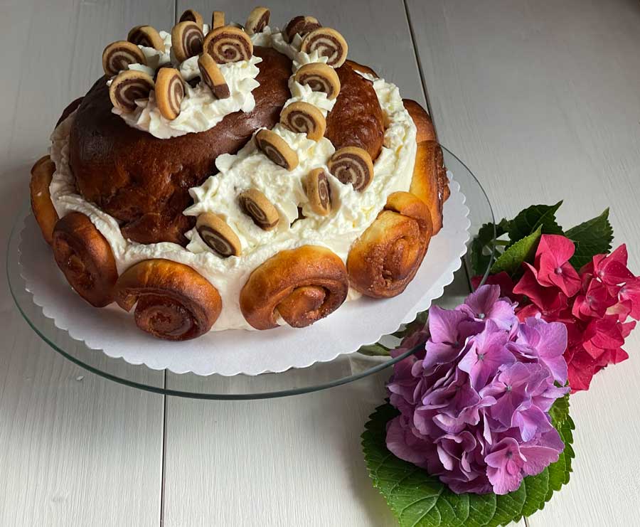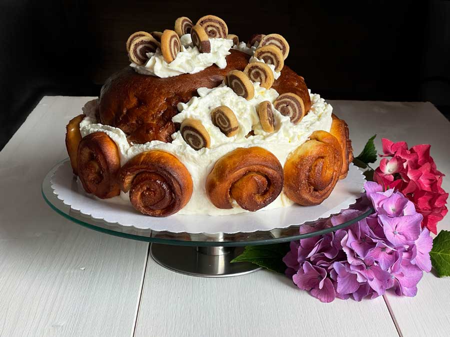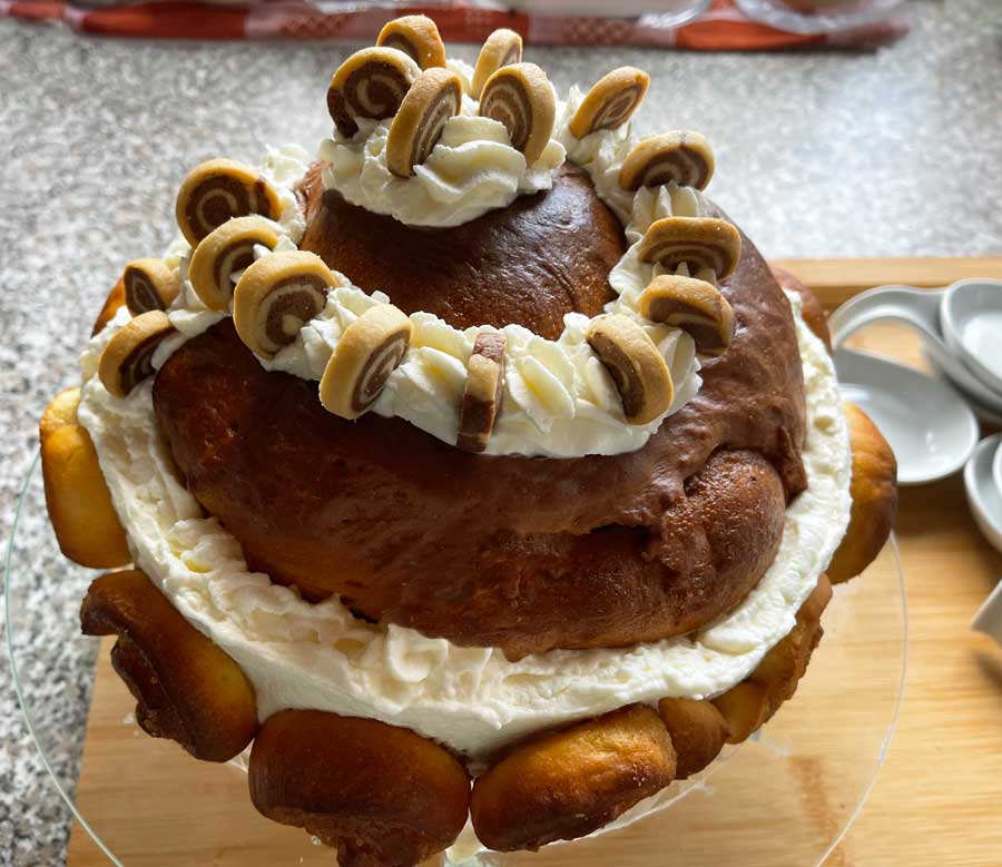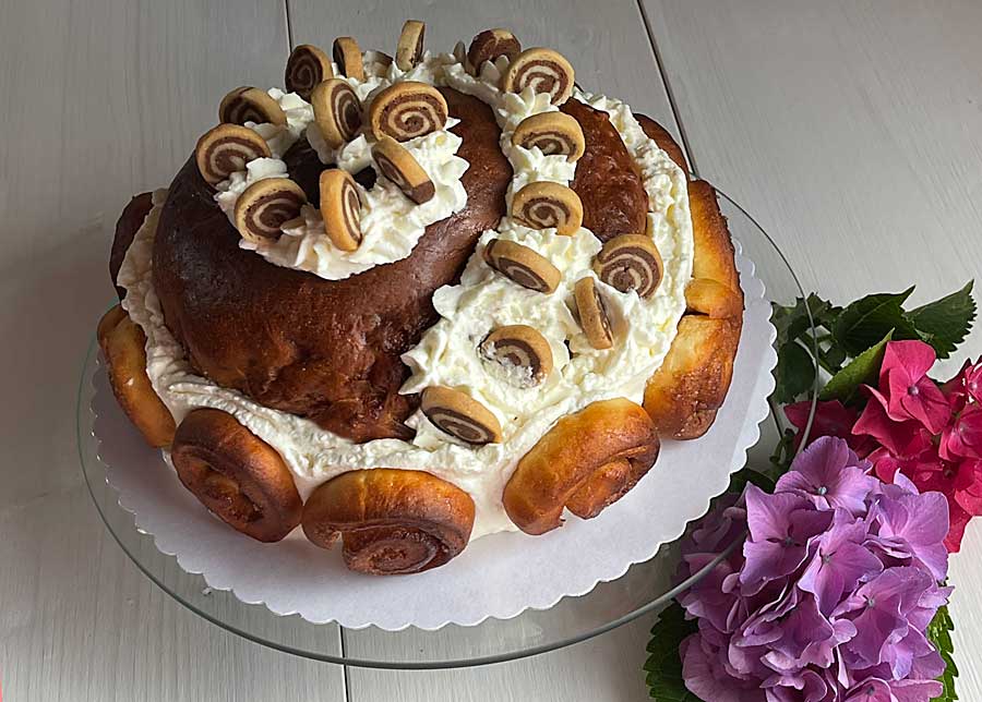 11. Ubić posłodzoną śmietanę na sztywno i obtoczyć nią brzegi dużych ślimaków cynamonowych. Podkreśl t również kształt spirali na górze kremem (zdjęcie 6). Na koniec wciśnij małe ślimaczki cynamonowe po obwodzie do śmietany.