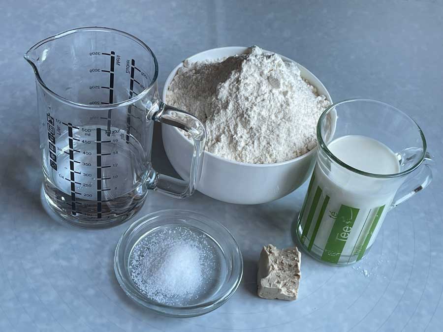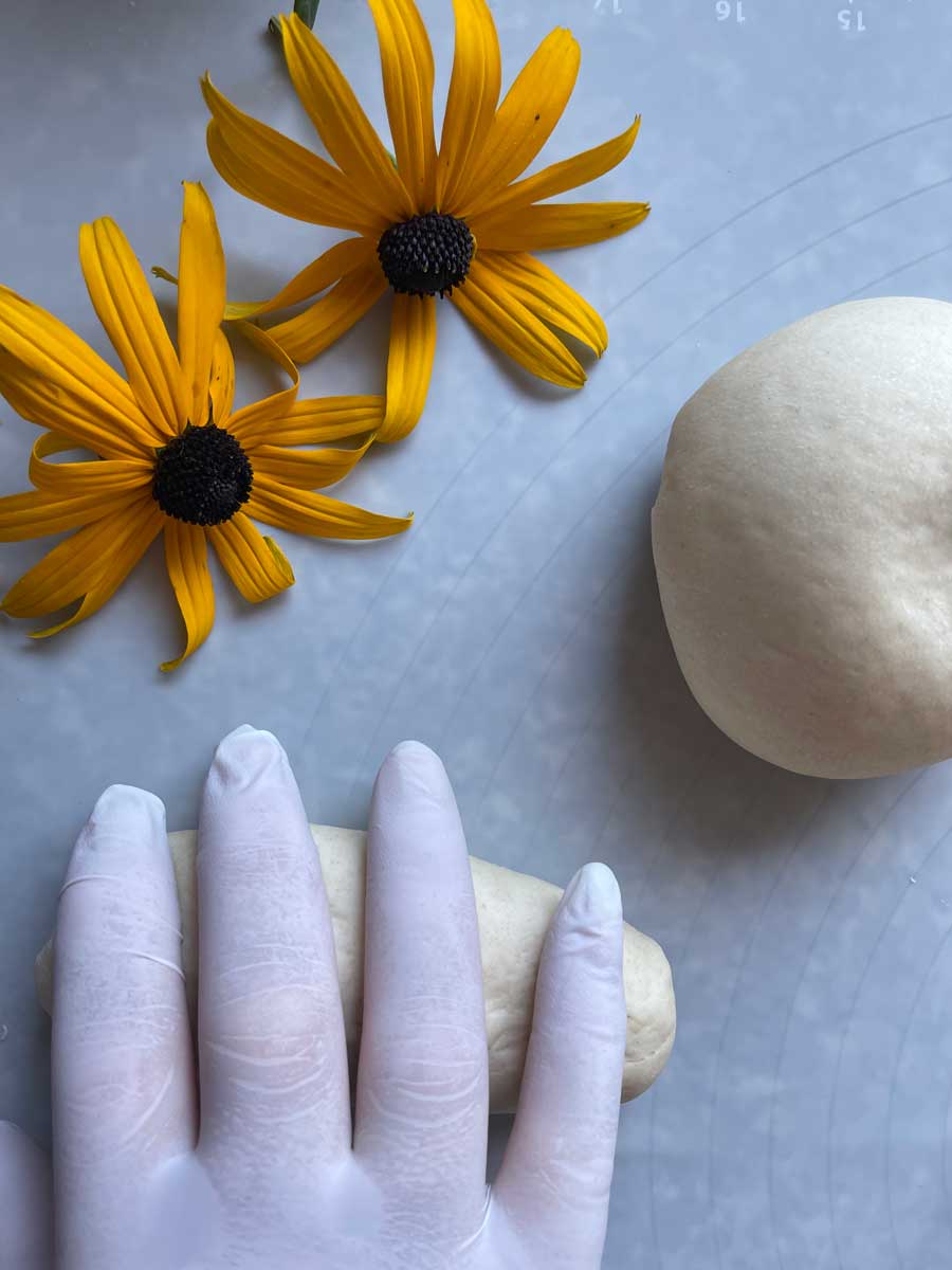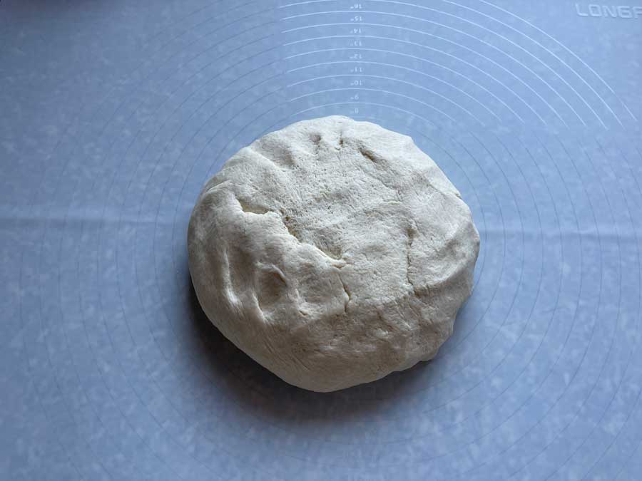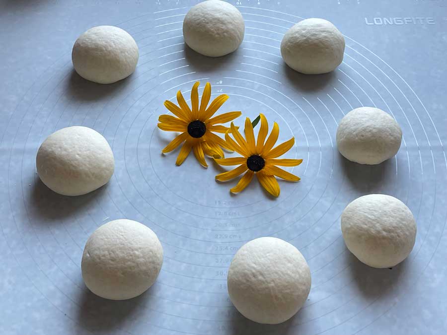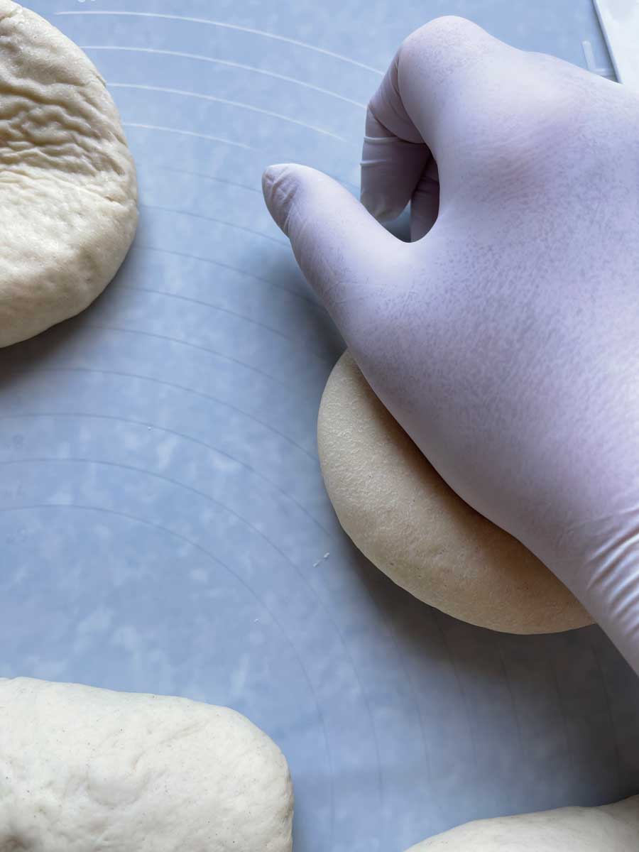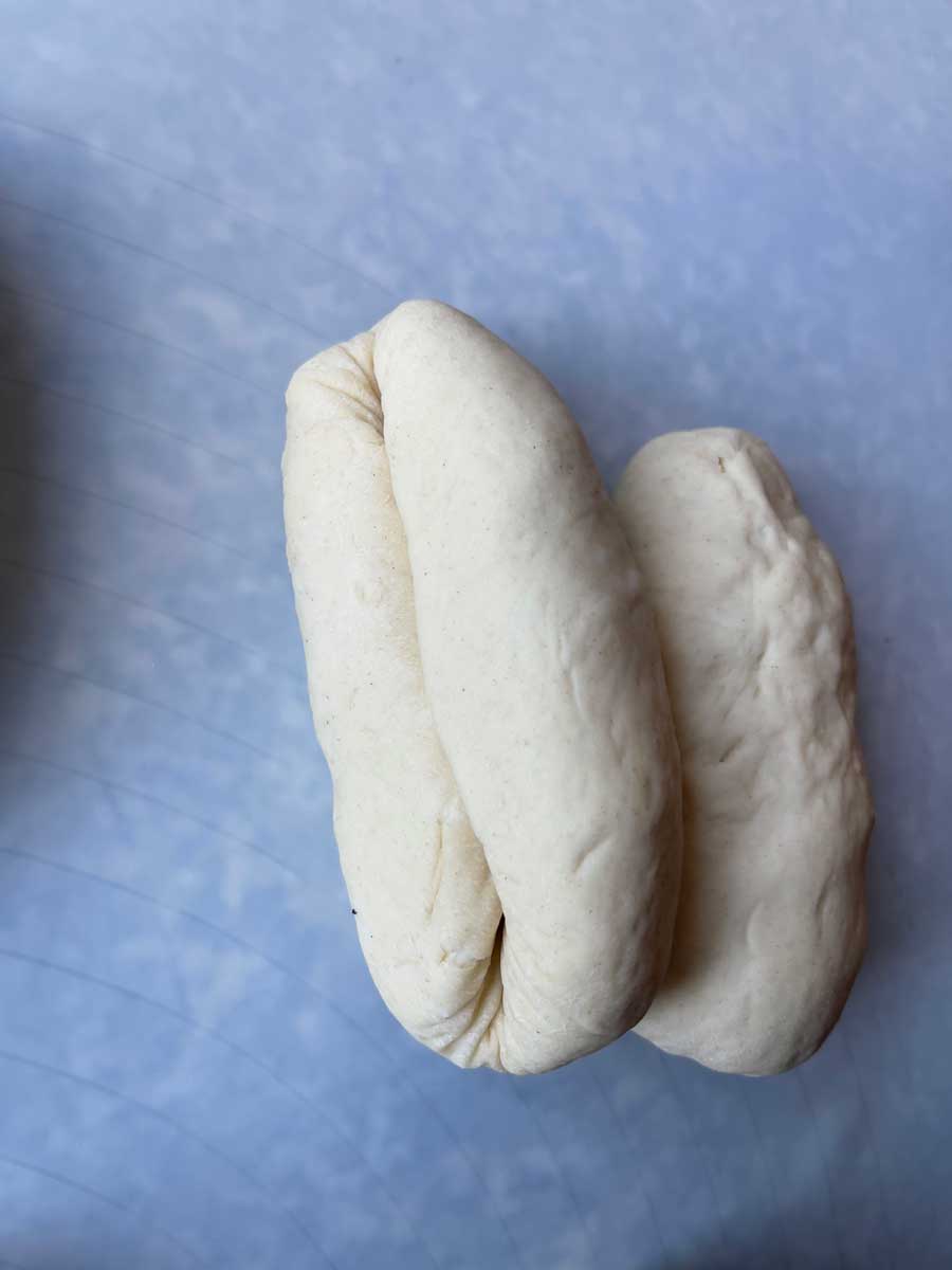 Wyciąć 8 kawałków ciasta, rozdrobnić i gotować końcem do dołu przez 10 minut w płótnie piekarskim. Dociśnij kawałki ciasta nasadą dłoni, aby uformować krążek zagłębiony pośrodku. Umieść jedną połowę krążka na drugiej. Odłóż koniec i lekko rozwałkuj ciasto 4 palcami. Końcówki kawałków ciasta przesuwają się do środka i powstaje proste wykończenie.