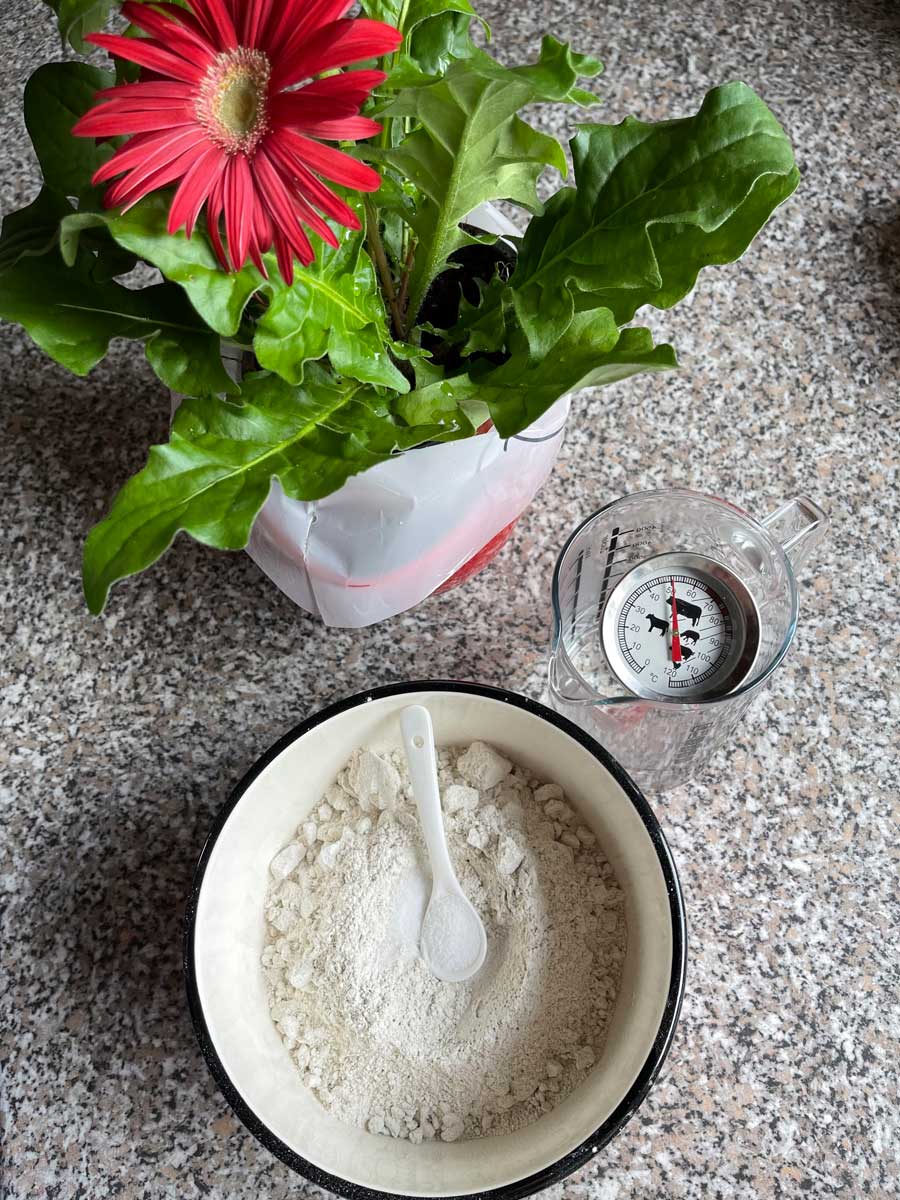 Wymieszaj składniki na zakwas i pozwól dojrzewać przez 12 godzin w temperaturze pokojowej (ok. 20°C).