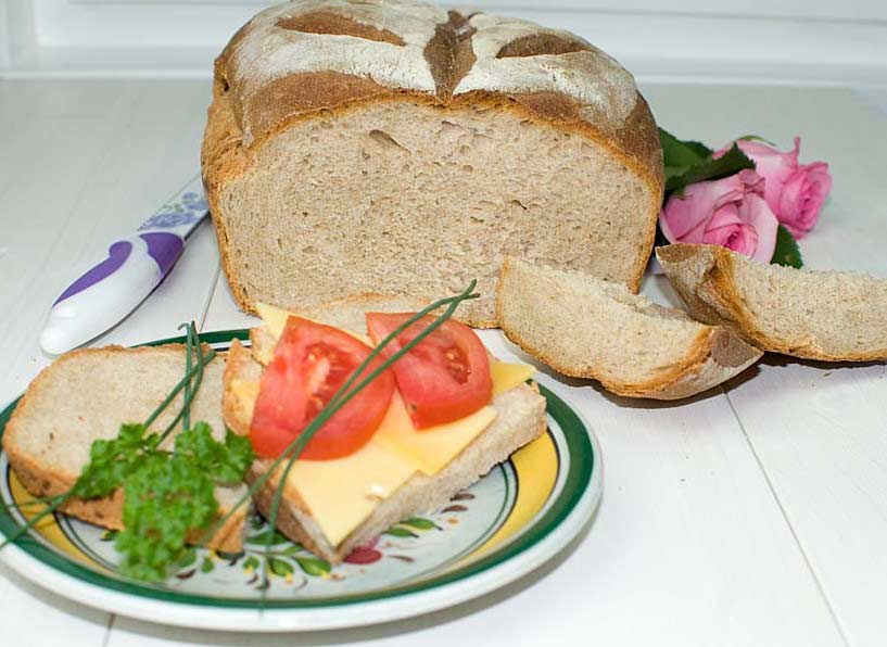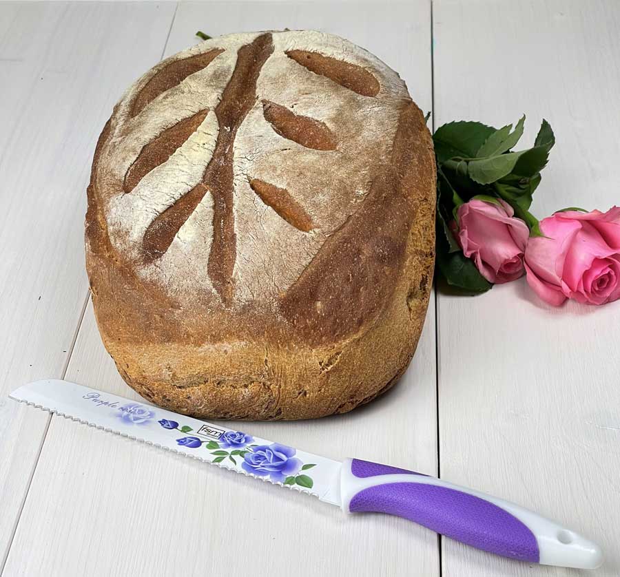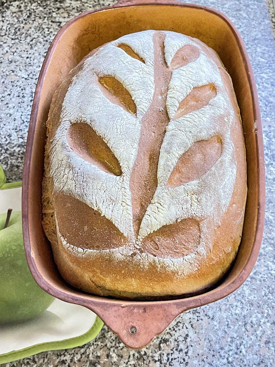 Posypać mąką i można w formie, można też przed włożeniem do formy naciąć wzorek na cieście, odstawić na 30 minut, aż ciasto nieco wypełni formę. Ciasto jest stabilne, więc można wyciąć na nim każdy wzorek. Piekarnik rozgrzać do 230°C, wstawić miskę z parującą wodą i formę z ciastem. Piec 10 min po czym zmniejszyć temperaturę i piec dalej 45 minut. Po 15 minutach wystawić miskę z wodą. Jeśli forma jest ceramiczna, można po wyjęciu chleba z niej, położyć go spodem do góry na ruszcie piekarnika, na górnej szynie i piec pod górną grzałką ok.8 minut, aż spód chleba zbrązowieje. Chleb będzie chrupiący, pachnący i mimo dużej zawartości mąki leciutki, bo dobrze wypieczony.