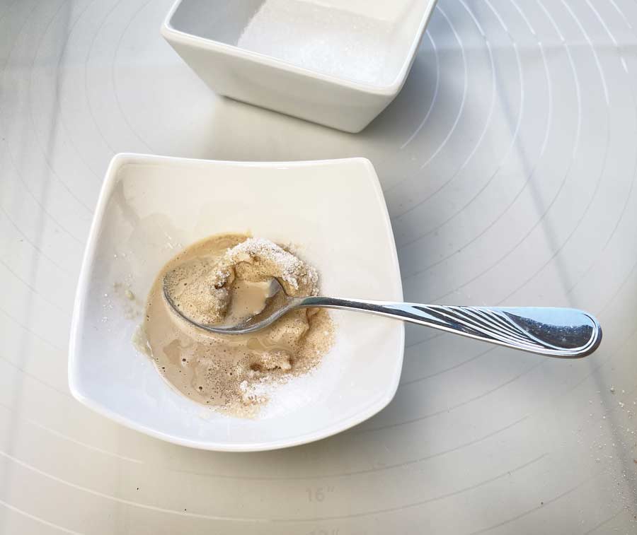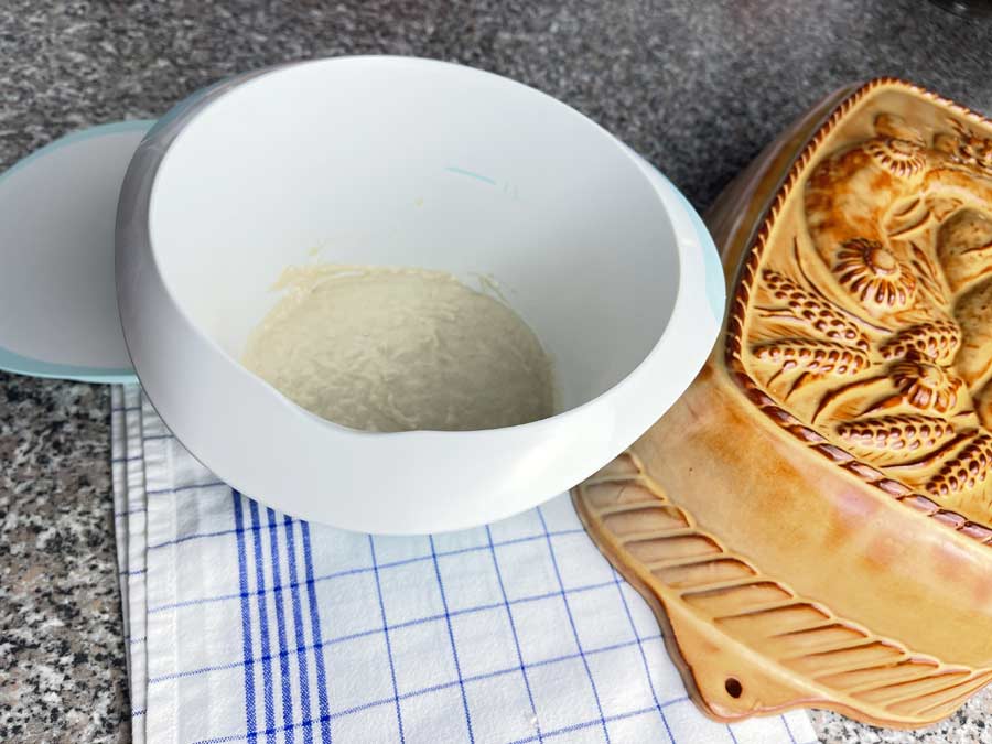 Ciasto wstępne przygotować dzień wcześniej. Mąkę wsypać do miski z przykrywką, drożdże rozpuścić w zimnej wodzie, wlać do mąki i dokładnie wymieszać. Miskę zamknąć i odstawić do następnego dnia.