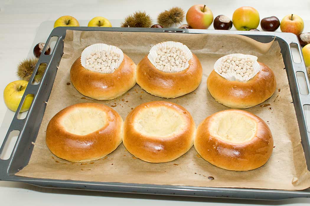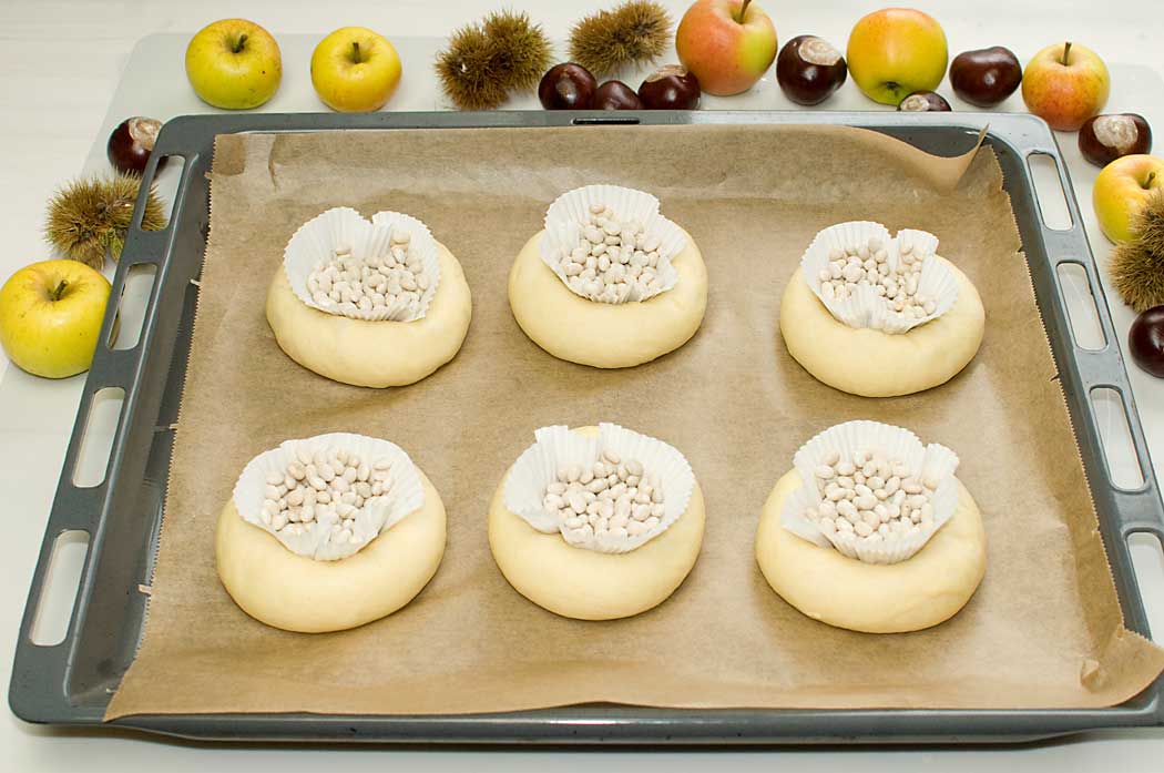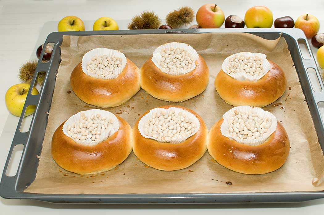 Wkładamy papierowe foremki i wypełniamy je fasolą. Zastosujemy tu tak zwane ślepe pieczenie. Tak przygotowane bułeczki pozostawić do wyrośnięcia pod przykryciem przez 20 minut.  Posmaruj bułeczki  roztrzepanym jajkiem z mlekiem i piecz w piekarniku wcześniej nagrzanym do 180°C  góra/dół na złoty kolor – w zależności od piekarnika około 15-20 minut, moje wymagały 19 minut.
