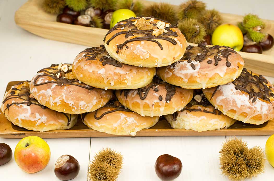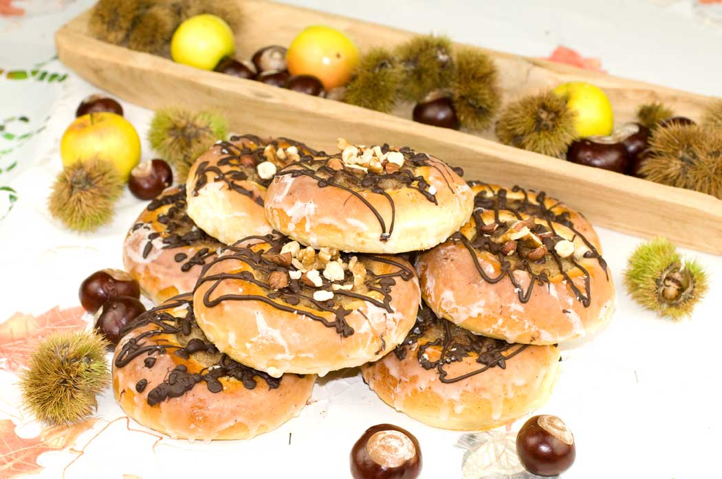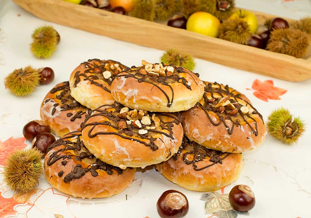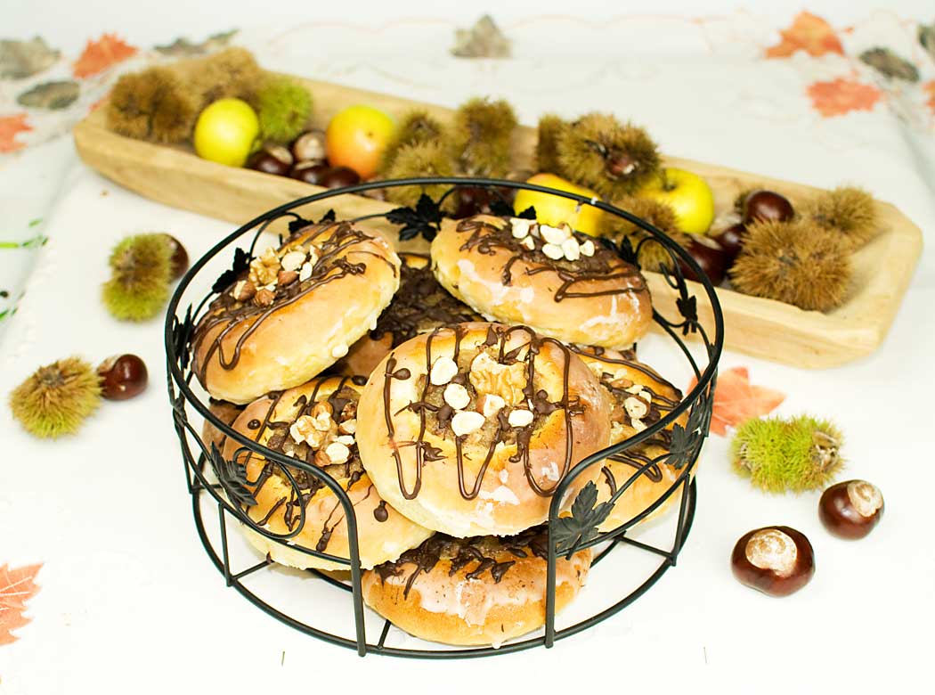 Lekko schłodzone, wypełnij masą jabłkowo- bananową, po 2 stołowe łyżki do każdej bułeczki i posmaruj  lukrem. Jeśli lubisz można pokropić rozpuszczoną czekoladą,  lub robić czekoladowe paski. Na koniec pokrój grubo kilka laskowych orzechów  i udekoruj nimi jesienne bułeczki. Smacznego!