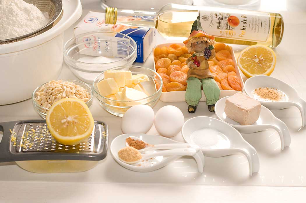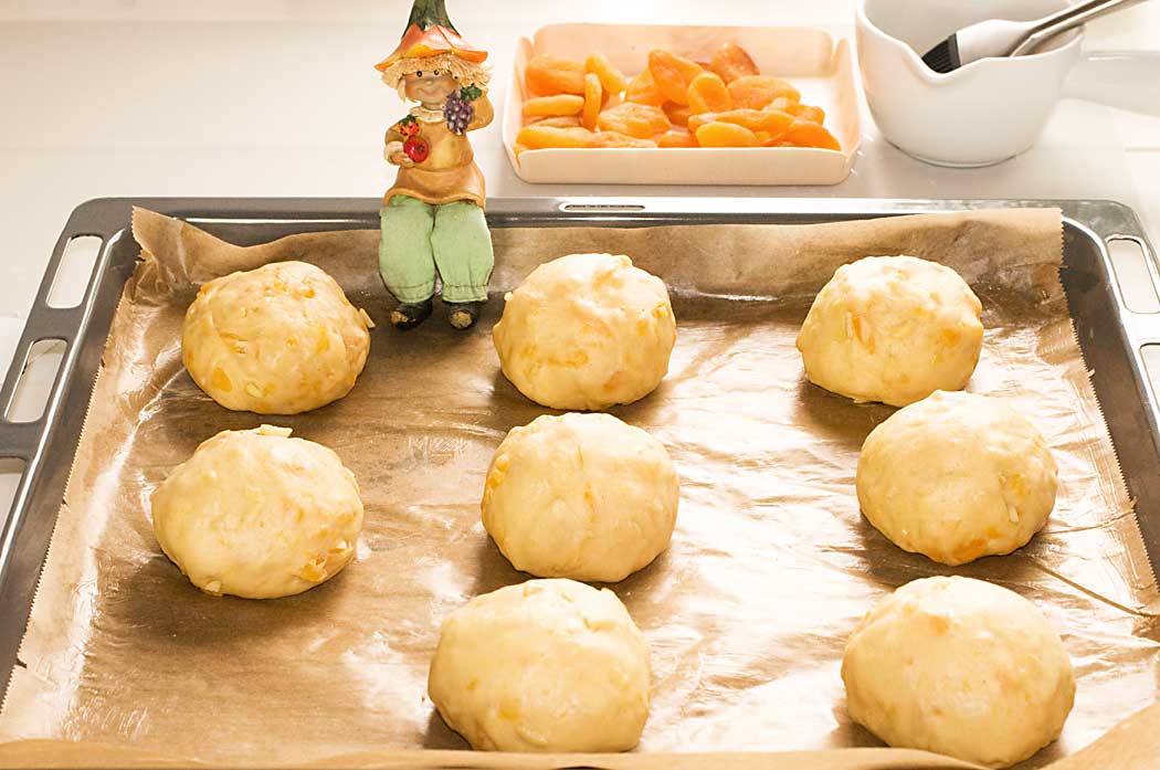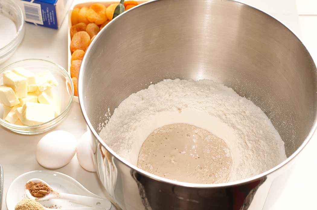 dodać sól, proszek do pieczenia, resztę cukru, masło, jajka i przyprawy, i zagnieść na gładkie ciasto za pomocą haka na mikserze ręcznym. Na koniec wgnieść wiórki migdałowe z 1 łyżką mąki i morele w likierze. Niech ciasto wyrośnie przez  40 minut.