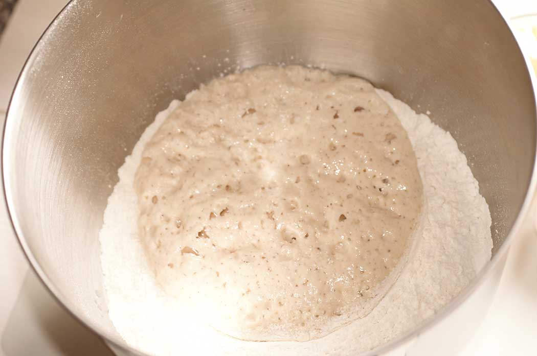 2. Wsyp mąkę do miski i na środku zrób zagłębienie. Do dołka dodać pokruszone drożdże, 25 g cukru. Wlej mleko i mieszaj, aż w zagłębieniu powstanie papkowate ciasto. Ciasto oprószyć mąką, przykryć ściereczką i odstawić na ok. 15 minut w ciepłe miejsce do wyrośnięcia.