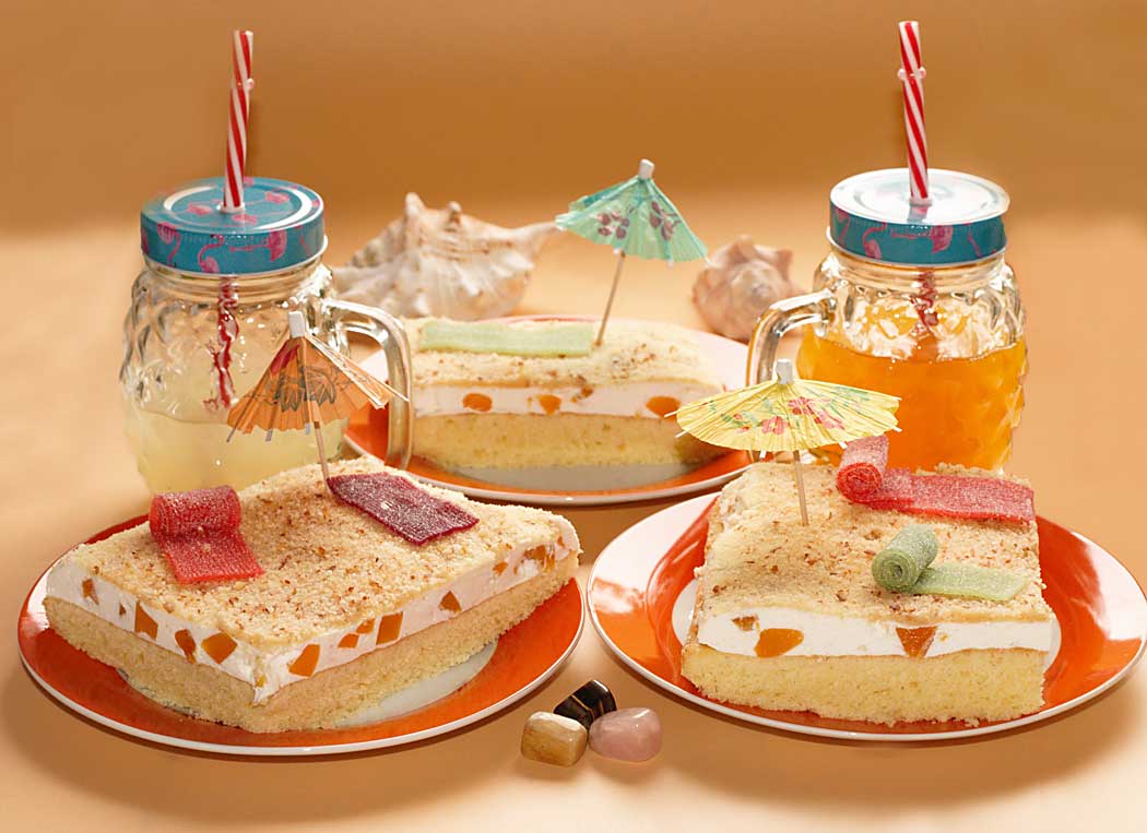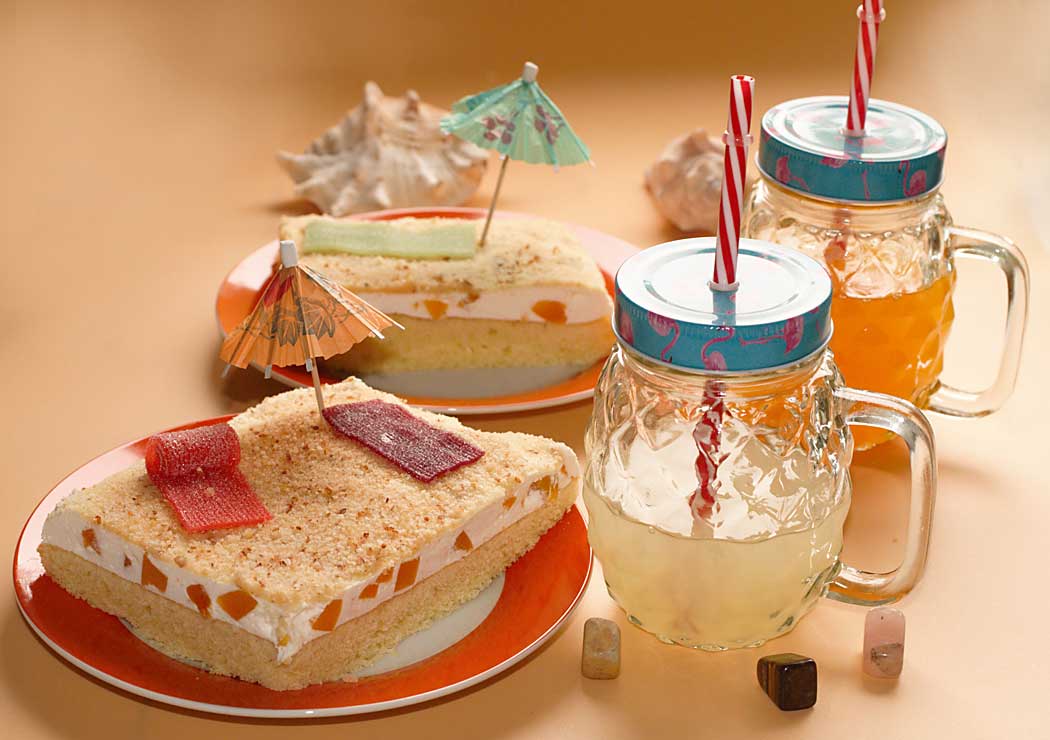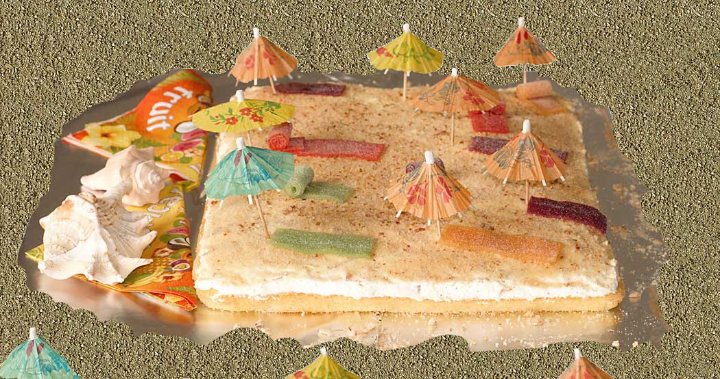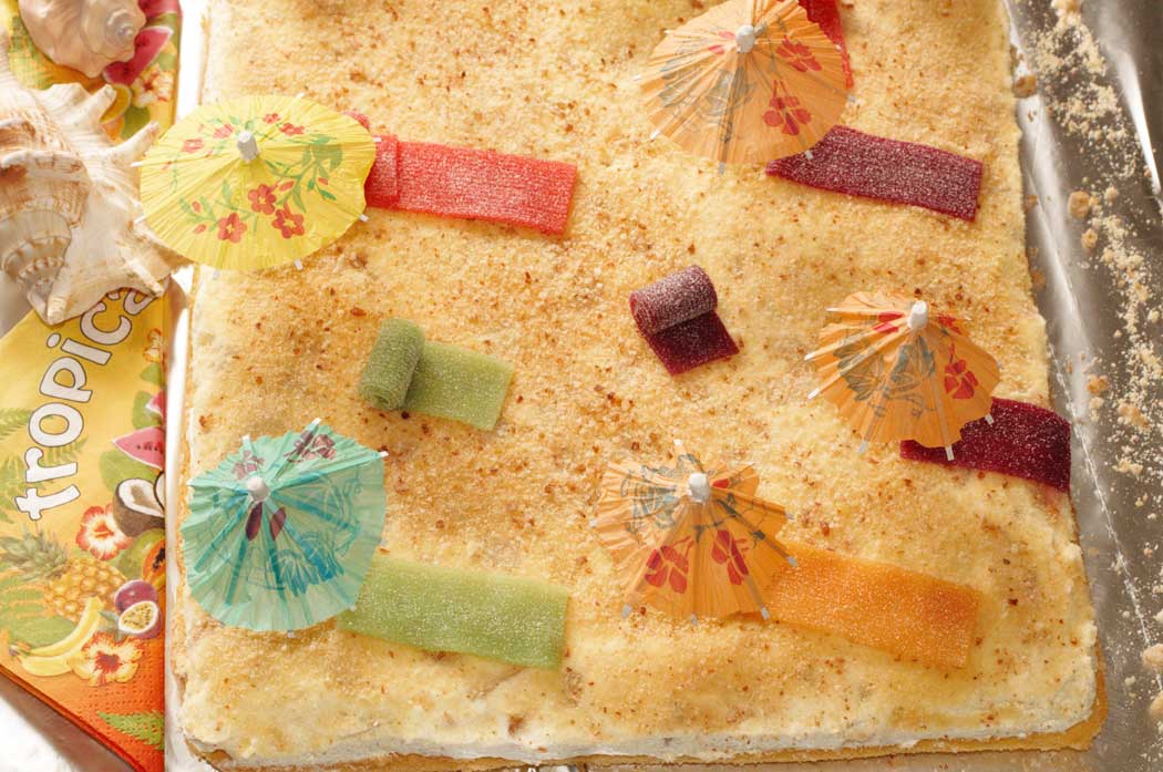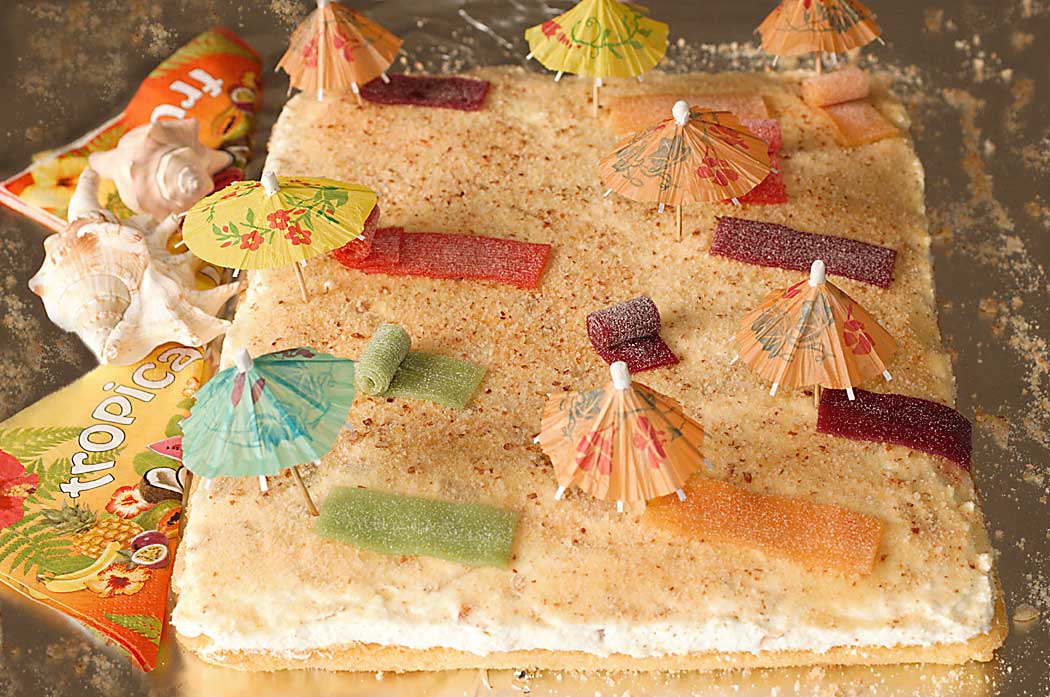 • Krem posyp okruchami biszkoptów, najlepiej używając sitka.  Udekoruj „ręcznikami plażowymi” i parasolami na „plażę”.😂