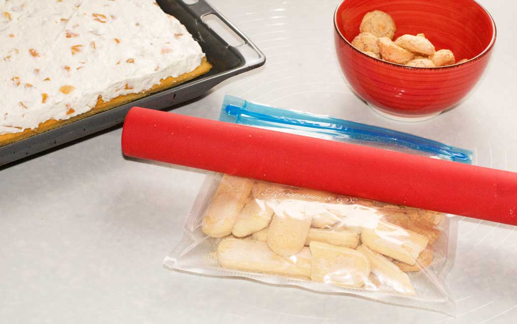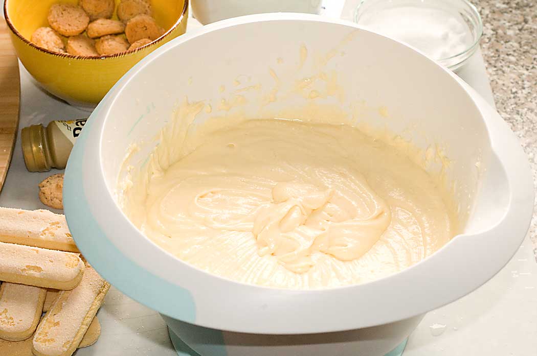 • 360 g Amarettini i 60 g biszkoptów za pomocą robota kuchennego  drobno pokruszyć, lub w woreczku do zamrażania rozgnieść wałkiem do ciasta.