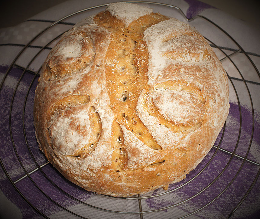- Bochenek chleba posmaruj niewielką ilością wody i posyp mąką. Wytnij ostrym nożem dowolny wzór na głębokość ok. 1 cm. Piecz na drugiej od dołu szynie nagrzanego piekarnika przez ok. 40 minut.