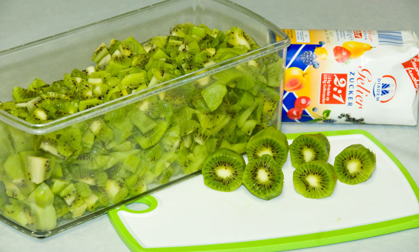 1. Kiwi obieramy możliwie najcieniej i płuczemy w zimnej wodzie, aby pozbyć się charakterystycznych dla kiwi włosków, następnie kroimy je w kostkę, wrzucamy do garnka i wsypujemy żelujący cukier. Doprowadzamy owoce do wrzenia, zmniejszamy ogień i gotujemy jeszcze 10- 15 minut ciągle mieszając.