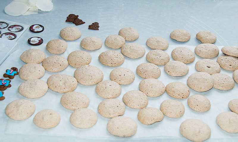 9. Pokryj makaroniki polewą w dowolny sposób i nałóż na niektóre orzechy laskowe a inne dowolne dekoracje.