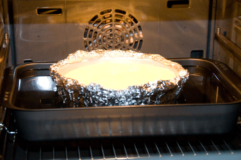 2. Owiń formę w folię aluminiową, ułóż 2 długie paski folii jeden na drugim, tworząc krzyż. Umieść formę na środku krzyża z folii, dociśnij folię do krawędzi i owiń ją. Umieść forme w dużym, wysokim naczyniu do pieczenia.