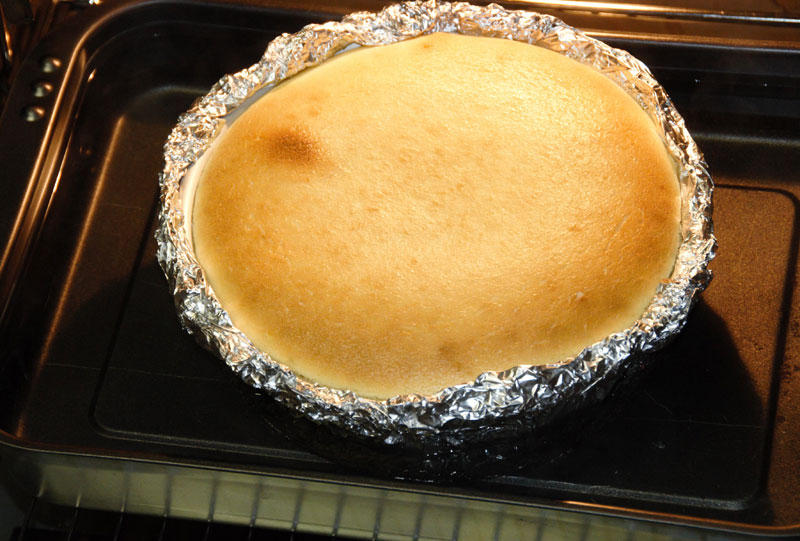 4. Piecz ciasto przez 60 -70 minut, aż boki sernika u góry formy lekko odchylą się od niej, a środek nadal może być drżący. Wyjmij ciasto z piekarnika i wody, zdejmij folię i pozostaw do ostygnięcia w lodówce przez noc.