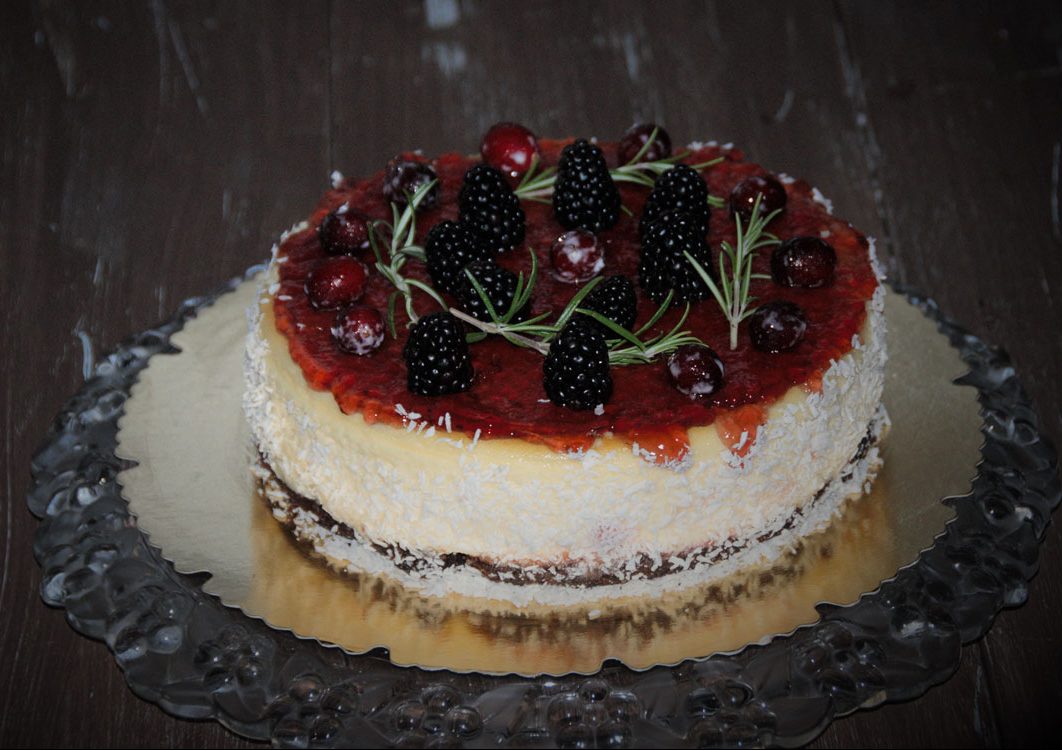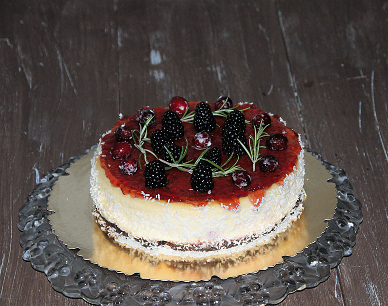 6. Wykonaj polewę zgodnie z instrukcją na opakowaniu Tortenguss, ale wodę zastąp winem czerwonym na grzańca , nie zapomnij o cukrze, a następnie polej ciasto. Sernik Glühwein udekoruj gałązkami rozmarynu, otoczoną w cukrze pudrze żurawiną i jeżynami.