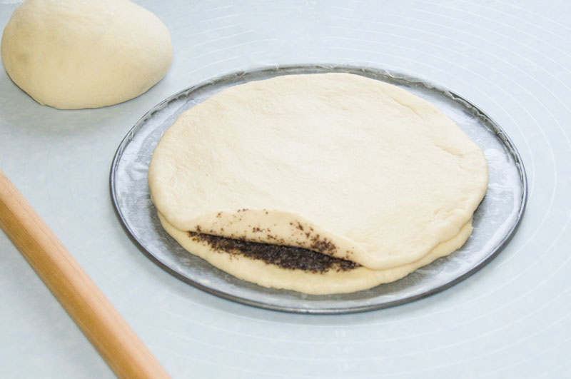 3. Po czasie wyrastania ponownie zagnieć ciasto drożdżowe i podziel je na trzy równe części. Każdą z trzech części rozwałkuj, na posypanej mąką stolnicy koło o średnicy ok. 20 cm.